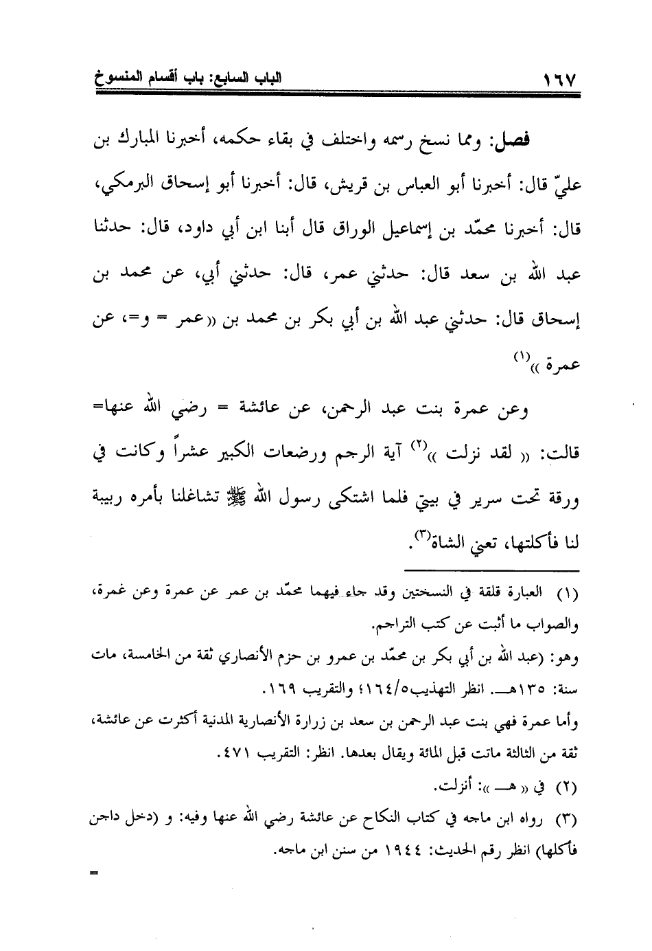 فَصْلٌ: وَمِمَّا نُسِخَ رَسْمُهُ وَاخْتُلِفَ فِي بَقَاءِ حُكْمِهِ، أَخْبَرَنَا الْمُبَارَكِ بْنُ عَلِيٍّ قَالَ: أَخْبَرَنَا أَبُو الْعَبَّاسِ بْنُ قُرَيْشٍ، قَالَ: أَخْبَرَنَا أَبُو إِسْحَاقَ الْبَرْمَكِيُّ، قَالَ: أَخْبَرَنَا مُحَمَّدُ بْنُ إِسْمَاعِيلَ الْوَرَّاقُ قَالَ أَبْنَا ابْنُ أَبِي دَاوُدَ، قَالَ: حَدَّثَنَا عَبْدُ اللَّهِ بْنُ سَعْدٍ قَالَ: حَدَّثَنِي عُمَرُ، قَالَ: حَدَّثَنِي أَبِي، عَنْ مُحَمَّدِ بْنِ إِسْحَاقَ قَالَ: حَدَّثَنِي عَبْدُ اللَّهِ بْنُ أَبِي بَكْرِ بْنِ مُحَمَّدِ بْنِ (عمر] و [، عن عمرة)