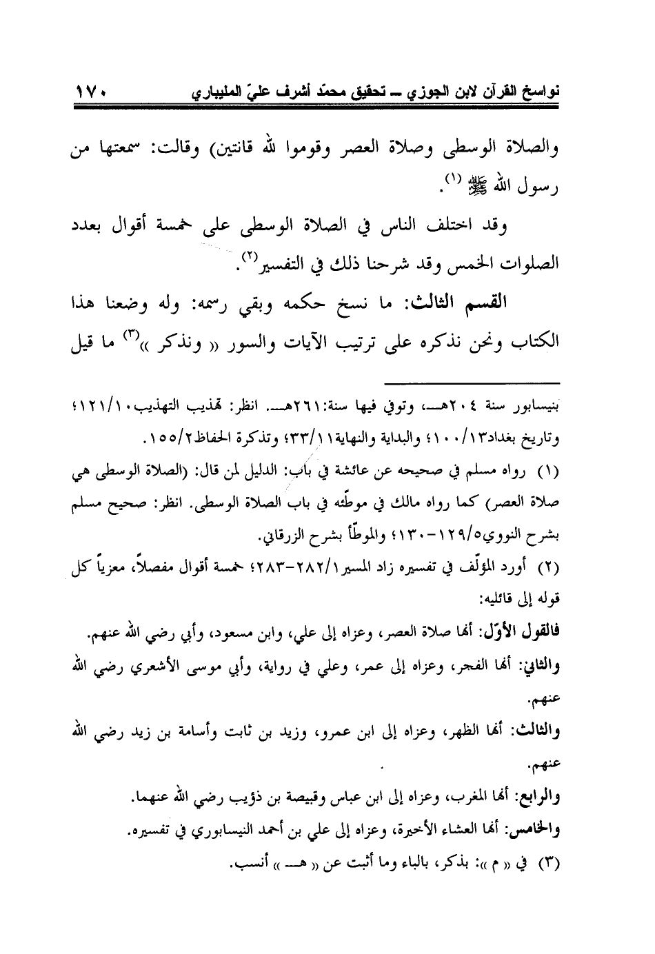 الْقِسْمُ الثَّالِثُ: مَا نُسِخَ حُكْمُهُ وَبَقِيَ رَسْمُهُ: وَلَهُ وَضَعْنَا هَذَا الْكِتَابَ وَنَحْنُ نَذْكُرُهُ عَلَى تَرْتِيبِ الْآيَاتِ وَالسُّوَرِ (ونذكر) 3 ما قيل