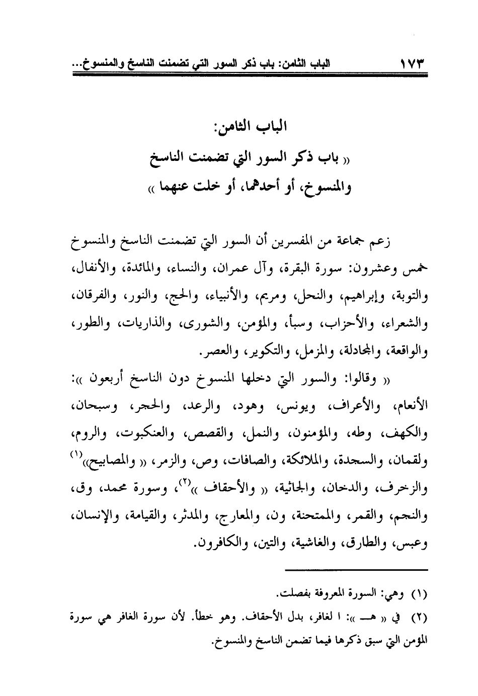 الْبَابُ الثَّامِنُ: بَابُ ذِكْرِ السُّوَرِ الَّتِي تَضَمَّنَتِ النَّاسِخَ وَالْمَنْسُوخَ، أَوْ أَحَدَهُمَا، أَوْ خَلَتْ عَنْهُمَا.