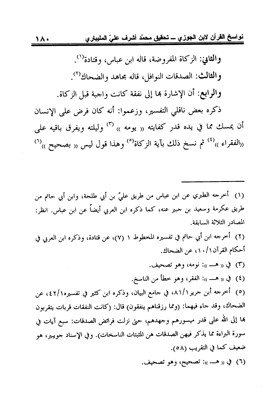 5 أخرجه أبن جرير1/ 81، في جامع البيان، وذكره ابن كثير في تفسيره1/ 42، عن الضحاك، وقد جاء فيهما: {وَمِمَّا رَزَقْنَاهُمْ يُنْفِقُونَ} قال: "كانت النفقات قربات يتقربون بها إلى الله على قدر ميسورهم وجهدهم، حتى نزلت فرائض الصدقات: سبع آيات في سورة البراءة مما يذكر فيهن الصدقات هن المثبتات الناسخات). وفي الإسناد جويبير، هو ضعيف كما في التقريب (58).
