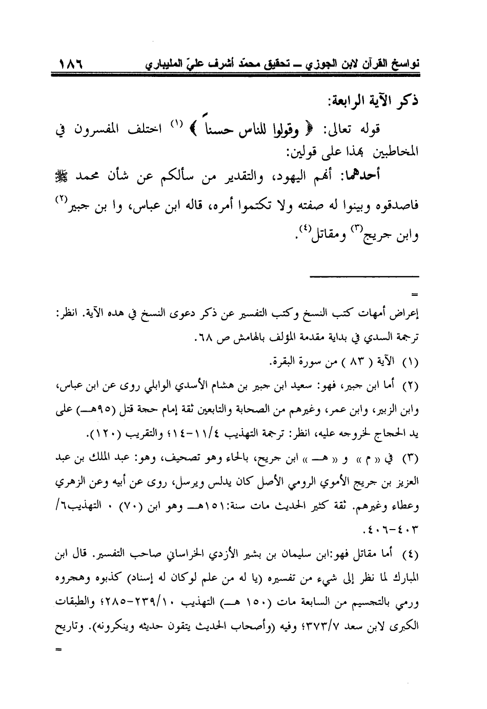 4 أما مقاتل فهو: ابن سليمان بن بشير الأزدي الخراساني صاحب التفسير. قال ابن المبارك لما نظر إلى شيء من تفسيره (يا له من علم لوكان له إسناد) كذبوه وهجروه ورمي بالتجسيم من السابعة مات (150 هـ) التهذيب 10/ 239 - 285؛ والطبقات الكبرى لابن سعد 7/ 373؛ وفيه (وأصحاب الحديث يتقون حديثه وينكرونه). وتاريح بغداد13/ 160 - 169. ذكر المؤلف في زاد المسير 1/ 110، هذا القول عن ابن عباس وابن جبير وابن حريج.