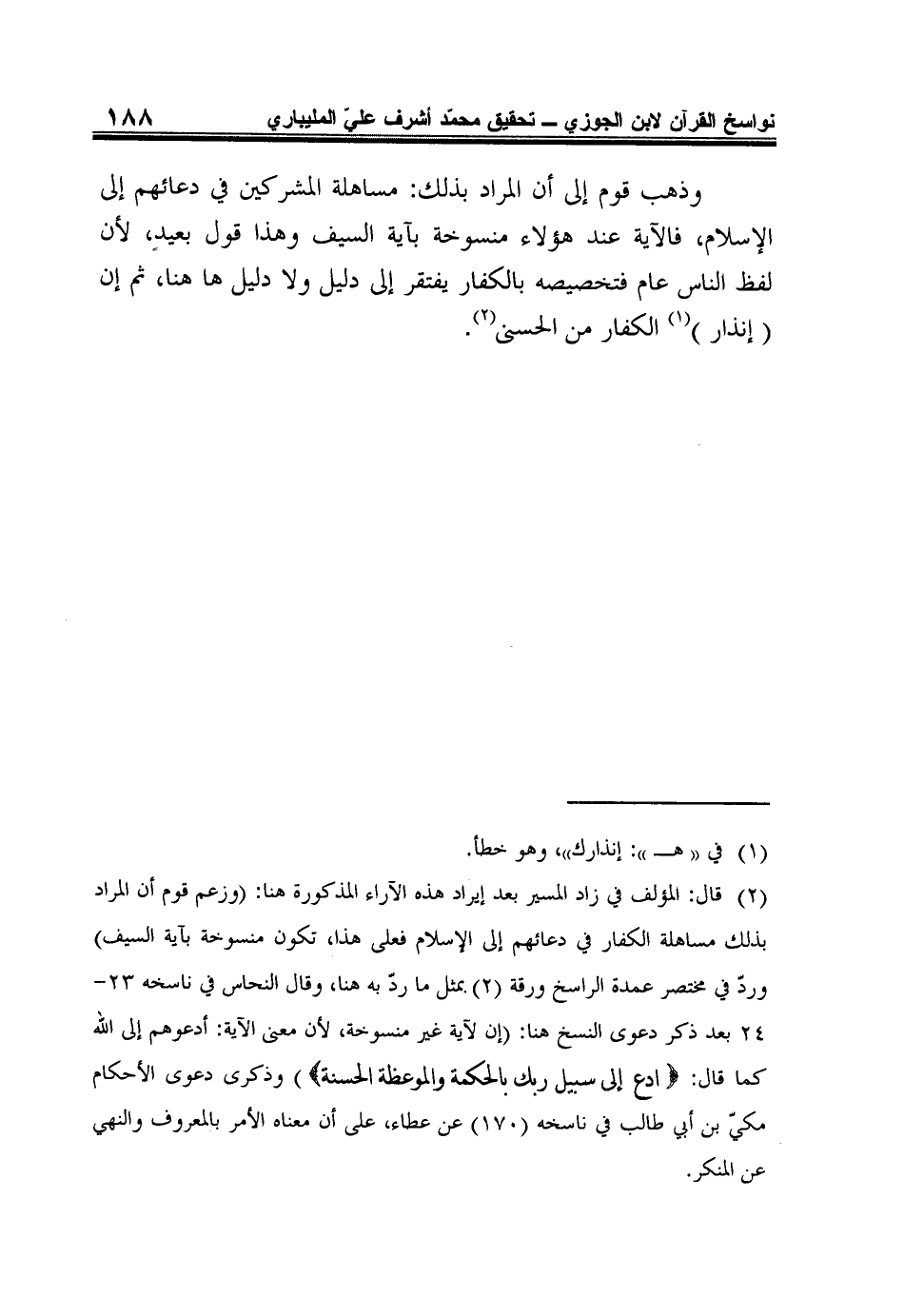 2 قال المؤلف في زاد المسير بعد إيراد هذه الآراء المذكورة هنا: "وزعم قوم أن المراد بذلك مساهلة الكفار في دعائهم إلى الإسلام فعلى هذا، تكون منسوخة بآية السيف" وردّ في مختصر عمدة الراسخ ورقة (2) بمثل ما ردّ به هنا، وقال النحاس في ناسخه 23 - 24 بعد ذكر دعوى النسخ هنا: "إن لآية غير منسوخة، لأن معنى الآية: أدعوهم إلى الله كما قال: {ادْعُ إِلَى سَبِيلِ رَبِّكَ بِالْحِكْمَةِ وَالْمَوْعِظَةِ الْحَسَنَة} وذكرى دعوى الأحكام مكيّ بن أبي طالب في ناسخه (170) عن عطاء، على أن معناه الأمر بالمعروف والنهي عن المنكر