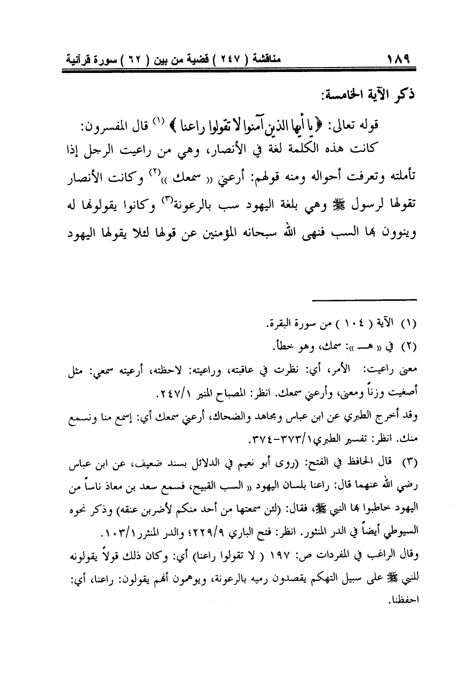 ذِكْرُ الْآيَةِ الْخَامِسَةِ: قَوْلُهُ تَعَالَى: {يَا أَيُّهَا الَّذِينَ آمَنُوا لا تَقُولُوا رَاعِنَا} 1.