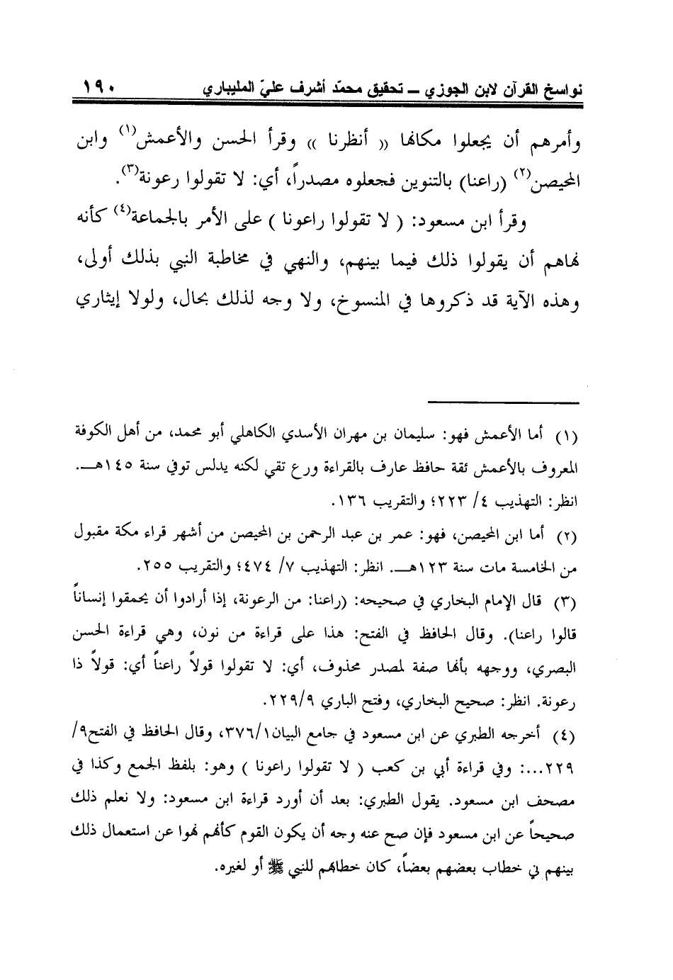 4 أخرجه الطبري عن ابن مسعود في جامع البيان1/ 376، وقال الحافظ في الفتح9/ 229: "وفي قراءة أبي بن كعب (لا تقولوا راعونا) وهو: بلفظ الجمع وكذا في مصحف ابن مسعود. يقول الطبري: بعد أن أورد قراءة ابن مسعود: ولا نعلم ذلك صحيحاً عن ابن مسعود فإن صح عنه وجه أن يكون القوم كأنهم نهوا عن استعمال ذلك بينهم ني خطاب بعضهم بعضاً، كان خطابهم للنبي صلى الله عليه وسلم أو لغيره".