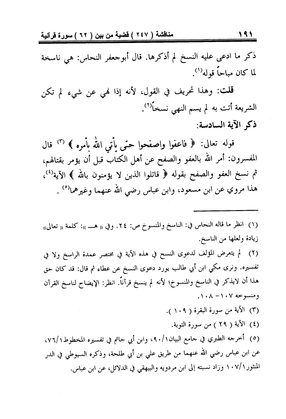قَالَ الْمُفَسِّرُونَ: أَمَرَ اللَّهُ بِالْعَفْوِ وَالصَّفْحِ عَنْ أَهْلِ الْكِتَابِ قَبْلَ أَنْ يُؤْمَرَ بِقِتَالِهِمْ، ثُمَّ نُسِخَ الْعَفْوُ وَالصَّفْحُ بِقَوْلِهِ: {قَاتِلُوا الَّذِينَ لا يُؤْمِنُونَ بِاللَّهِ} الْآيَةَ4، هَذَا مَرْوِيٌّ عَنِ ابْنِ مَسْعُودٍ، وَابْنِ عَبَّاسٍ رَضِيَ اللَّهُ عنهما وغيرهما5.