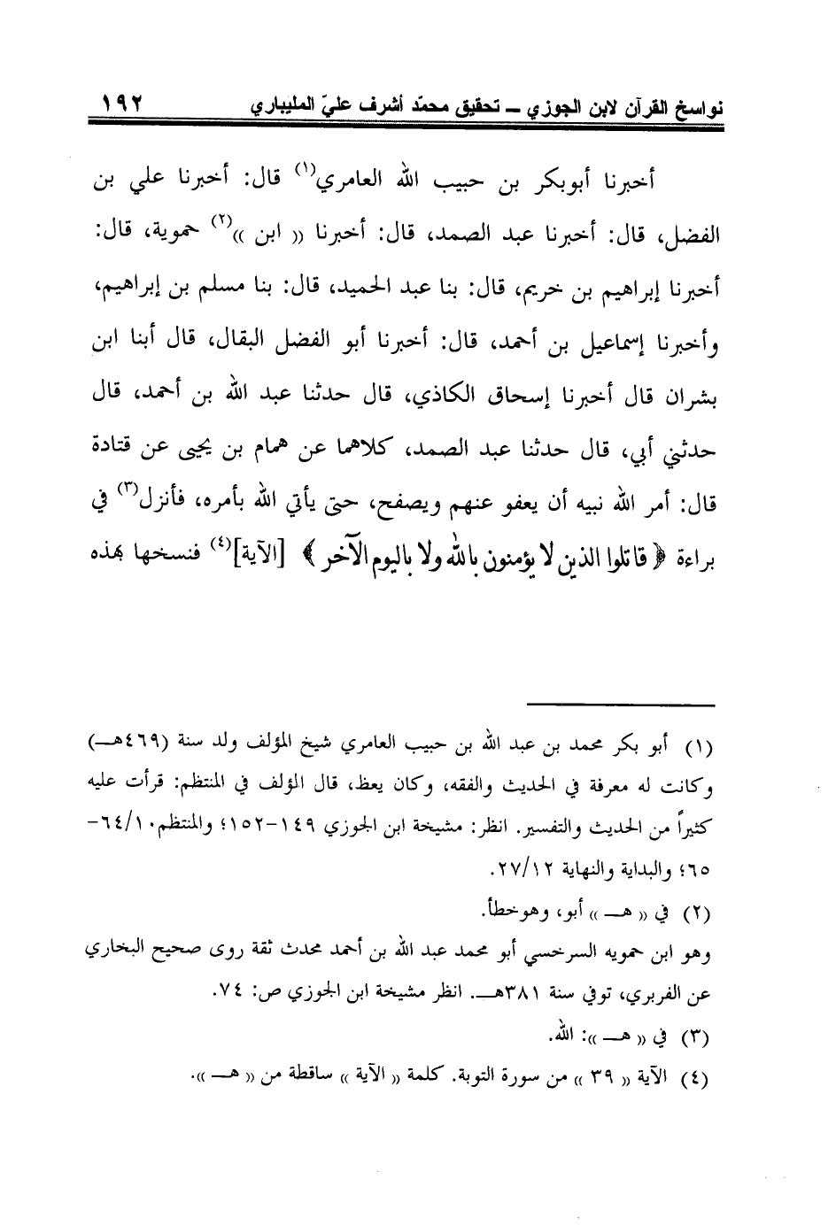 أخبرنا أبوبكر بن حبيب الله الْعَامِرِيُّ1 قَالَ: أَخْبَرَنَا عَلِيُّ بْنُ الْفَضْلِ، قَالَ: أَخْبَرَنَا عَبْدُ الصَّمَدِ، قَالَ: أَخْبَرَنَا (ابْنُ) 2 حَمُّويَةَ، قَالَ: أخبرنا إبراهيم بن خريم، قال: بنا عبد الحميد، قال: بنا مُسْلِمُ بْنُ إِبْرَاهِيمَ، وَأَخْبَرَنَا إِسْمَاعِيلُ بْنُ أَحْمَدَ، قَالَ: أَخْبَرَنَا أَبُو الْفَضْلِ الْبَقَّالُ، قَالَ أَبْنَا ابْنُ بِشْرَانَ قَالَ أَخْبَرَنَا إِسْحَاقُ الْكَاذِيُّ، قَالَ حَدَّثَنَا عَبْدُ اللَّهِ بْنُ أَحْمَدَ، قَالَ حَدَّثَنِي أَبِي، قَالَ حدثنا عبد الصمد، كِلاهُمَا عَنْ هَمَّامِ بْنِ يَحْيَى عَنْ قَتَادَةَ قَالَ: أَمَرَ اللَّهُ نَبِيَّهُ أَنْ يَعْفُوَ عَنْهُمْ وَيَصْفَحَ، حَتَّى يَأْتِيَ اللَّهُ بِأَمْرِهِ، فَأَنْزَلَ3 فِي بَرَاءَةٍ {قَاتِلُوا الَّذِينَ لا يُؤْمِنُونَ بِاللَّهِ وَلا بِالْيَوْمِ الْآخِرِ} [الآية] 4 فنسخها بهذه