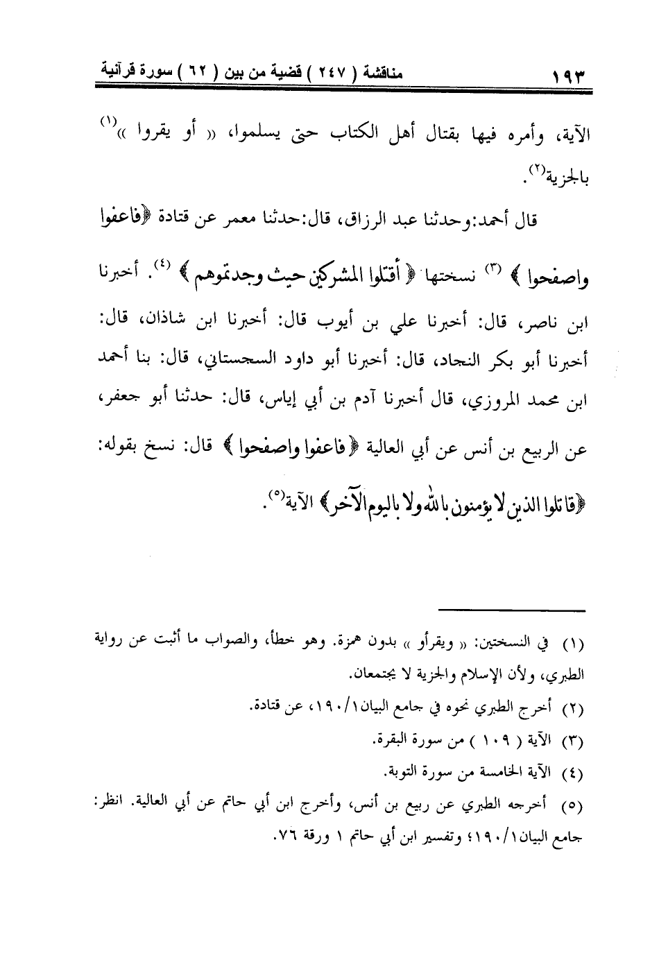 قَالَ أَحْمَدُ: وَحَدَّثَنَا عَبْدُ الرَّزَّاقِ، قَالَ: حَدَّثَنَا مَعْمَرٌ عَنْ قتادة {فَاعْفُوا وَاصْفَحُوا} 3 نَسَخَتْهَا {فَاقْتُلُوا الْمُشْرِكِينَ حَيْثُ وَجَدْتُمُوهُمْ} 4. أَخْبَرَنَا ابُنْ نَاصِرٍ، قَالَ: أَخْبَرَنَا عَلِيُّ بْنُ أَيُّوبَ قَالَ: أَخْبَرَنَا ابْنُ شَاذَانَ، قَالَ: أَخْبَرَنَا أَبُو بَكْرٍ النَّجَّادُ، قَالَ: أَخْبَرَنَا أَبُو داود السجستاني، قال: بنا أحمد ابن مُحَمَّدٍ الْمَرْوَزِيُّ، قَالَ أَخْبَرَنَا آدَمُ بْنُ أَبِي إِيَاسٍ، قَالَ: حَدَّثَنَا أَبُو جَعْفَرٍ، عَنِ الرَّبِيعِ بْنِ أَنَسٍ عَنْ أَبِي الْعَالِيَةِ {فَاعْفُوا وَاصْفَحُوا} قَالَ: نُسِخَ بِقَوْلِهِ: {قَاتِلُوا الَّذِينَ لا يُؤْمِنُونَ بِاللَّهِ وَلا بِالْيَوْمِ الآخِرِ} الآية5.