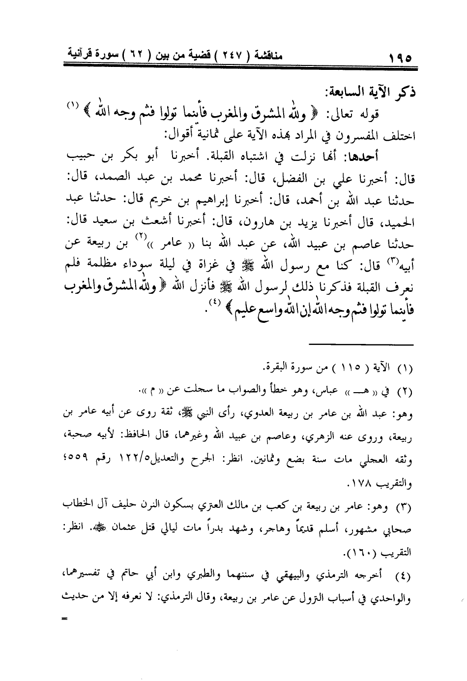 4 أخرجه الترمذي والبيهقي في سننهما والطبري وابن أبي حاتم في تفسيرهما، والواحدي في أسباب النزول عن عامر بن ربيعة، وقال الترمذي: لا نعرفه إلا من حديث أشعث وقد ضعف. انظر: صحيح الترمذي5/ 205؛ والسنن الكبرى للبيهقي2/ 10؛ وجامع البيان1/ 401؛ وتفسير بن أبي حاتم المخطوط اورقة 92؛ وأسباب النزول ص: 22.