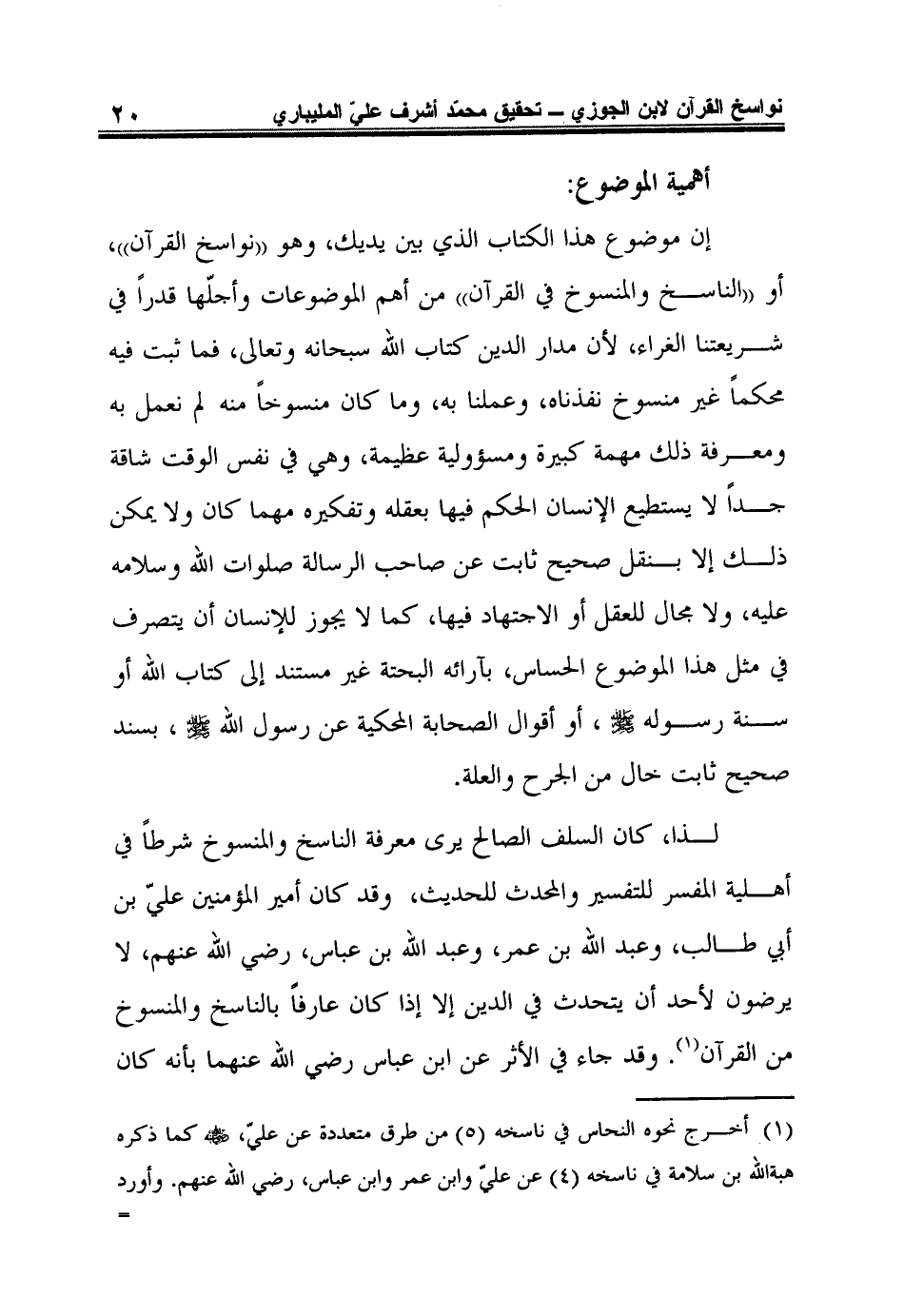 إن موضوع هذا الكتاب الذي بين يديك، وهو (نواسخ القرآن)، أو (الناسخ والمنسوخ في القرآن) من أهم الموضوعات وأجلّها قدراً في شريعتنا الغراء، لأن مدار الدين كتاب الله سبحانه وتعالى، فما ثبت فيه محكماً غير منسوخ نفذناه، وعملنا به، وما كان منسوخاً منه لم نعمل به ومعرفة ذلك مهمة كبيرة ومسؤولية عظيمة، وهي في نفس الوقت شاقة جداً لا يستطيع الإنسان الحكم فيها بعقله وتفكيره مهما كان ولا يمكن ذلك إلا بنقل صحيح ثابت عن صاحب الرسالة صلوات الله وسلامه عليه، ولا مجال للعقل أو الاجتهاد فيها، كما لا يجوز للإنسان أن يتصرف في مثل هذا الموضوع الحساس، بآرائه البحتة غير مستند إلى كتاب الله أو سنة رسوله صلى الله عليه وسلم، أو أقوال الصحابة المحكية عَنْ رَسُولِ اللَّهِ صَلَّى اللَّهُ عليه وسلم، بسند صحيح ثابت خال من الجرح والعلة.