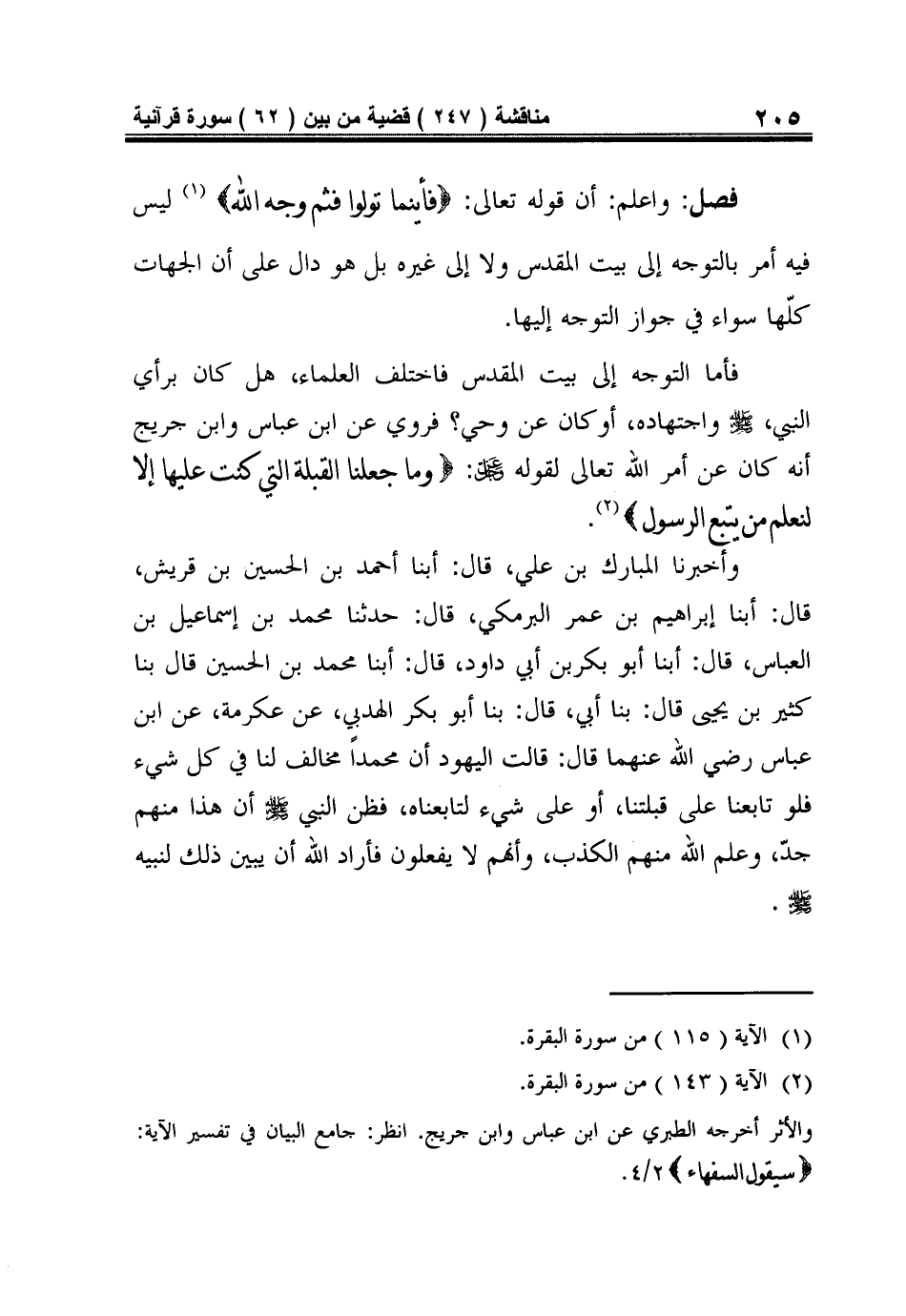 والأثر أخرجه الطبري عَنِ ابْنِ عَبَّاسٍ وَابْنِ جُرَيْجٍ. انظر: جامع البيان في تفسير الآية: {سَيَقُولُ السُّفَهَاءُ} 2/ 4.