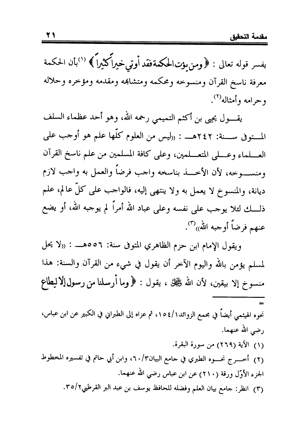 يقول يحيى بن أكثم التميمي رحمه الله، وهو أحد عظماء السلف المتوفى سنة: 242هـ: "ليس من العلوم كلّها علم هو أوجب على العلماء وعلى المتعلمين، وعلى كافة المسلمين من علم ناسخ القرآن ومنسوخه، لأن الأخذ بناسخه واجب فرضاً والعمل به واجب لازم ديانة، والمنسوخ لا يعمل به ولا ينتهى إليه، فالواجب على كلّ عالم، علم ذلك لئلا يوجب على نفسه وعلى عباد الله أمراً لم يوجبه الله، أو يضع عنهم فرضاً أوجبه الله"3.