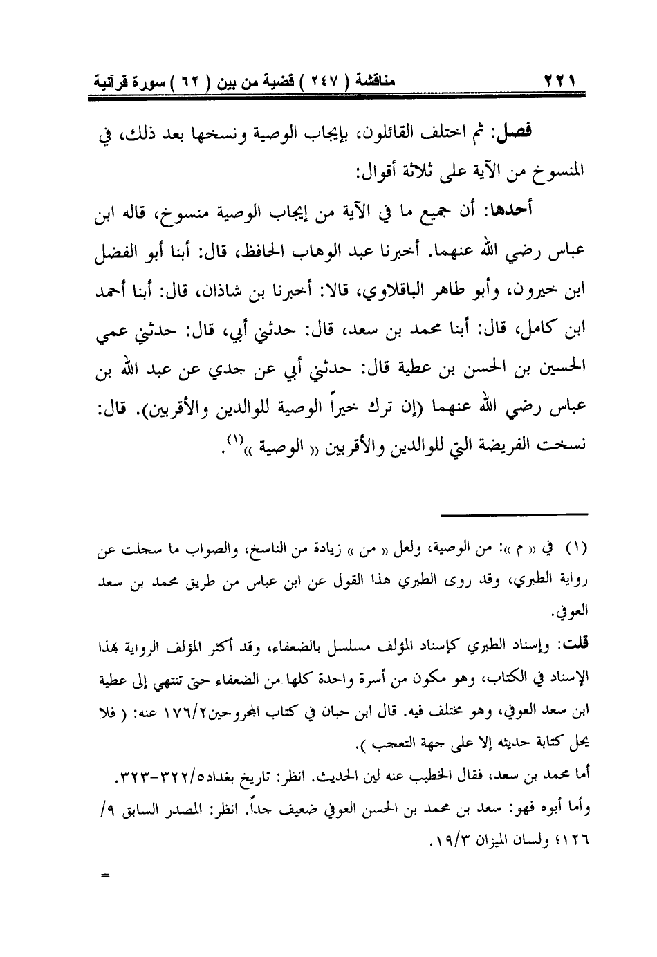 أحدها: أَنَّ جَمِيعَ مَا فِي الْآيَةِ مِنْ إِيجَابِ الْوَصِيَّةِ مَنْسُوخٌ، قَالَهُ ابْنِ عَبَّاسٍ رَضِيَ اللَّهُ عَنْهُمَا. أَخْبَرَنَا عَبْدُ الْوَهَّابِ الْحَافِظُ، قَالَ: أبنا أبو الفضل ابن خَيْرُونُ، وَأَبُو طَاهِرٍ الْبَاقِلاوِيُّ، قَالا: أخبرنا بْنُ شَاذَانَ، قَالَ: أَبْنَا أَحْمَدُ ابْنُ كَامِلٍ، قَالَ: أَبْنَا مُحَمَّدُ بْنُ سَعْدٍ، قَالَ: حَدَّثَنِي أَبِي، قَالَ: حَدَّثَنِي عَمِّي الْحُسَيْنُ بْنُ الْحَسَنِ بْنِ عَطِيَّةَ قَالَ: حَدَّثَنِي أَبِي عَنْ جَدِّي عَنْ عَبْدِ اللَّهِ بْنِ عَبَّاسٍ رَضِيَ اللَّهُ عَنْهُمَا {إِنْ تَرَكَ خَيْراً الْوَصِيَّةُ لِلْوَالِدَيْنِ وَالأَقْرَبِينَ}. قَالَ: "نَسَخَتِ الْفَرِيضَةُ الَّتِي لِلْوَالِدَيْنِ والأقربين (الوصية) "1.