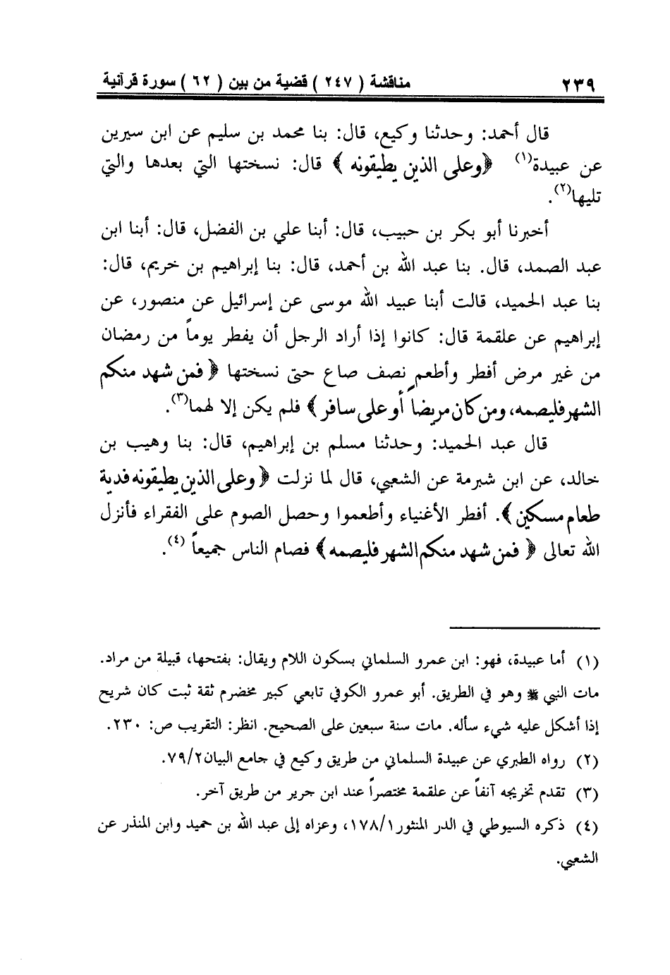 قَالَ أحمد: وحدثنا وكيع، قال: بنا مُحَمَّدُ بْنُ سُلَيْمٍ عَنِ ابْنِ سِيرِينَ عَنْ عُبَيْدَةَ1 {وَعَلَى الَّذِينَ يُطِيقُونَهُ} قَالَ: نَسَخَتْهَا الَّتِي بَعْدَهَا وَالَّتِي تَلِيهَا2.