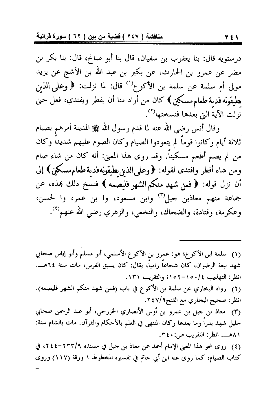درستويه قال: بنا يعقوب بن سفيان، قال بنا أبو صالح، قال: بنا بَكْرُ بْنُ مُضَرٍ عَنْ عَمْرِو بْنِ الْحَارِثِ، عَنْ بُكَيْرِ بْنِ عَبْدِ اللَّهِ بْنِ الأَشَجِّ عَنْ يَزِيدَ مَوْلَى أُمِّ سَلَمَةَ عَنْ سَلَمَةَ بْنِ الأَكْوَعِ1 قَالَ: لَمَّا نَزَلَتْ: {وَعَلَى الَّذِينَ يُطِيقُونَهُ فِدْيَةٌ طَعَامُ مِسْكِينٍ} كَانَ مَنْ أَرَادَ مِنَّا أَنْ يُفْطِرَ وَيَفْتَدِيَ، فَعَلَ حَتَّى نَزَلَتِ الْآيَةُ الَّتِي بَعْدَهَا فَنَسَخَتْهَا2.