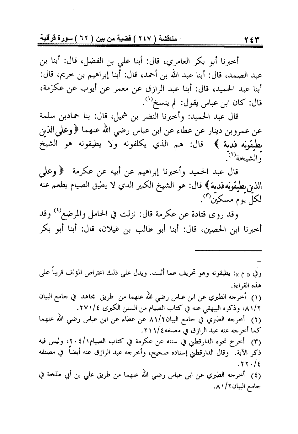 قَالَ عَبْدُ الْحَمِيدِ: وَأَخْبَرَنَا النَّضْرُ بْنُ شُمَيْلٍ، قال: بنا حمادبن سلمة عن عمروبن دِينَارٍ عَنْ عَطَاءٍ عَنِ ابْنِ عَبَّاسٍ رَضِيَ اللَّهُ عَنْهُمَا {وَعَلَى الَّذِينَ يُطِيقُونَهُ فِدْيَةٌ} قَالَ: هُمُ الَّذِي يُكَلَّفُونَهُ وَلا يُطِيقُونَهُ هُوَ الشَّيْخُ وَالشَّيْخَةُ2.