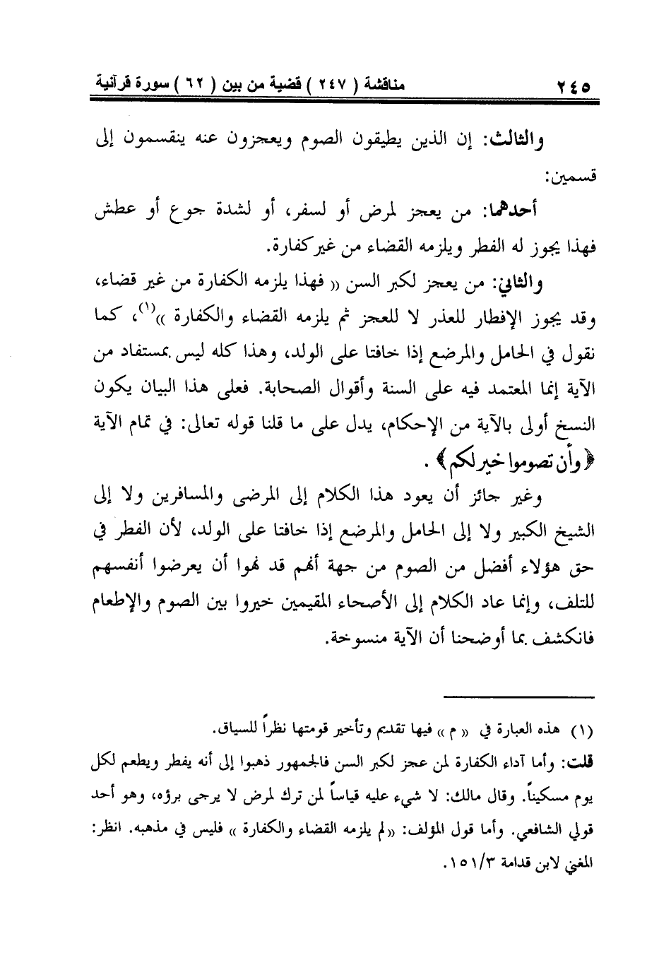 وَالثَّانِي: مَنْ يَعْجَزُ لِكِبَرِ السِّنِّ (فهذا يَلْزَمُهُ الْكَفَّارَةُ مِنْ غَيْرِ قَضَاءٍ، وَقَدْ يَجُوزُ الْإِفْطَارُ لِلْعُذْرِ لا للعجز ثم يلزمه القضاء والكفارة) 1، كَمَا نَقُولُ فِي الْحَامِلِ وَالْمُرْضِعِ إِذَا خَافَتَا عَلَى الْوَلَدِ، وَهَذَا كُلُّهُ لَيْسَ بِمُسْتَفَادٍ مِنَ الْآيَةِ إِنَّمَا الْمُعْتَمَدُ فِيهِ عَلَى السُّنَّةِ وَأَقْوَالِ الصَّحَابَةِ. فَعَلَى هَذَا الْبَيَانِ يكون النسخ أولى بالآية من الإحكام، يَدُلُّ عَلَى مَا قُلْنَا قَوْلُهُ تَعَالَى: فِي تَمَامِ الْآيَةِ {وَأَنْ تَصُومُوا خَيْرٌ لَكُمْ}.
