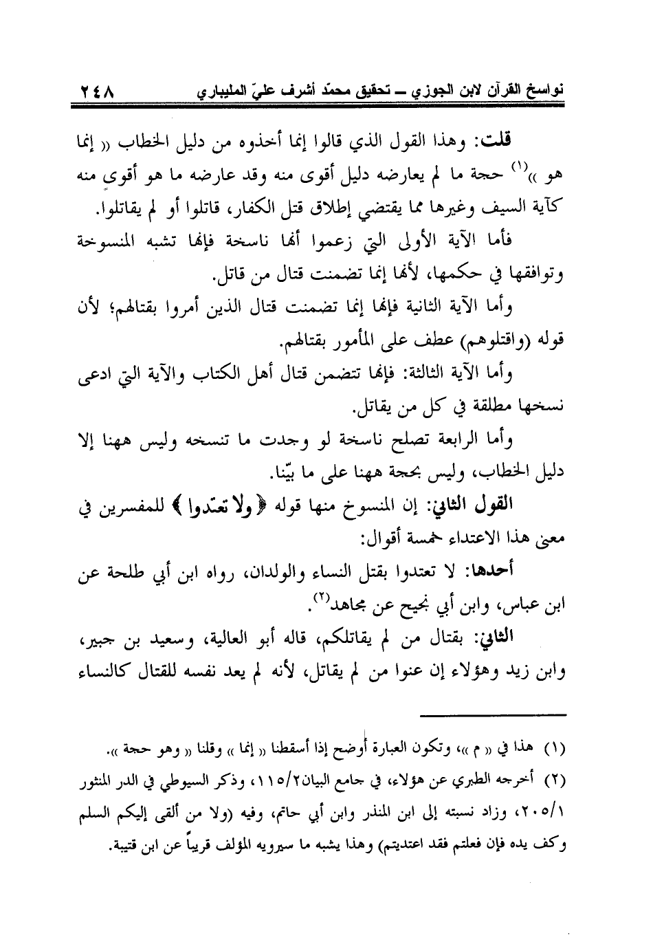 2 أخرجه الطبري عن هؤلاء، في جامع البيان2/ 115، وذكر السيوطي في الدر المنثور1/ 205، وزاد نسبته إلى ابن المنذر وابن أبي حاتم، وفيه (ولا من ألقى إليكم السلم وكف يده فإن فعلتم فقد اعتديتم) وهذا يشبه ما سيرويه المؤلف قريباً عن ابن قتيبة.