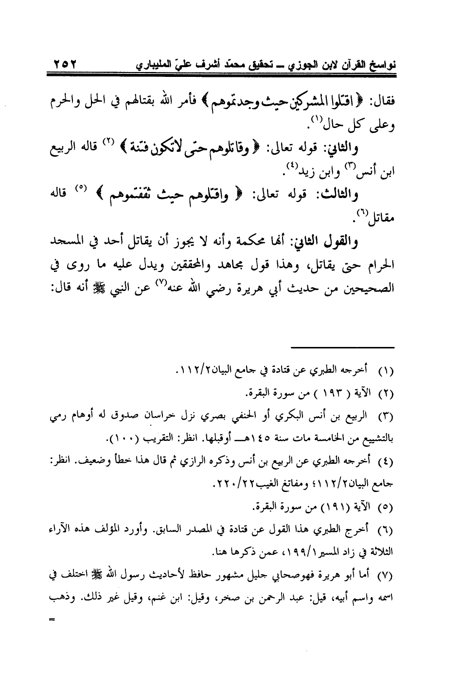 وَالْقَوْلُ الثَّانِي: أَنَّهَا مُحْكَمَةٌ وَأَنَّهُ لا يَجُوزُ أَنْ يُقَاتِلَ أَحَدٌ فِي الْمَسْجِدِ الْحَرَامِ حَتَّى يُقَاتَلَ، وَهَذَا قَوْلُ مُجَاهِدٍ وَالْمُحَقِّقِينَ وَيَدُلُّ عَلَيْهِ مَا رُوِيَ فِي الصَّحِيحَيْنِ مِنْ حَدِيثِ أَبِي هُرَيْرَةَ رَضِيَ اللَّهُ عَنْهُ7 عَنِ النَّبِيِّ صَلَّى اللَّهُ عَلَيْهِ وَسَلَّمَ أنه قال: