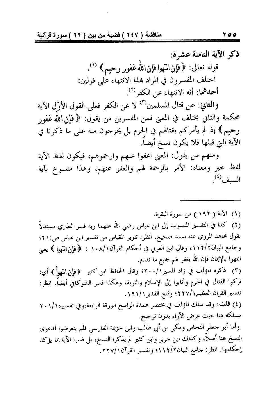 4 قلت: وقد سلك المؤلف في مختصر عمدة الراسخ الورقة الرابعة، وفي تفسيره1/ 201 مسلكه هنا حيث عرض الآراء بدون ترجيح.