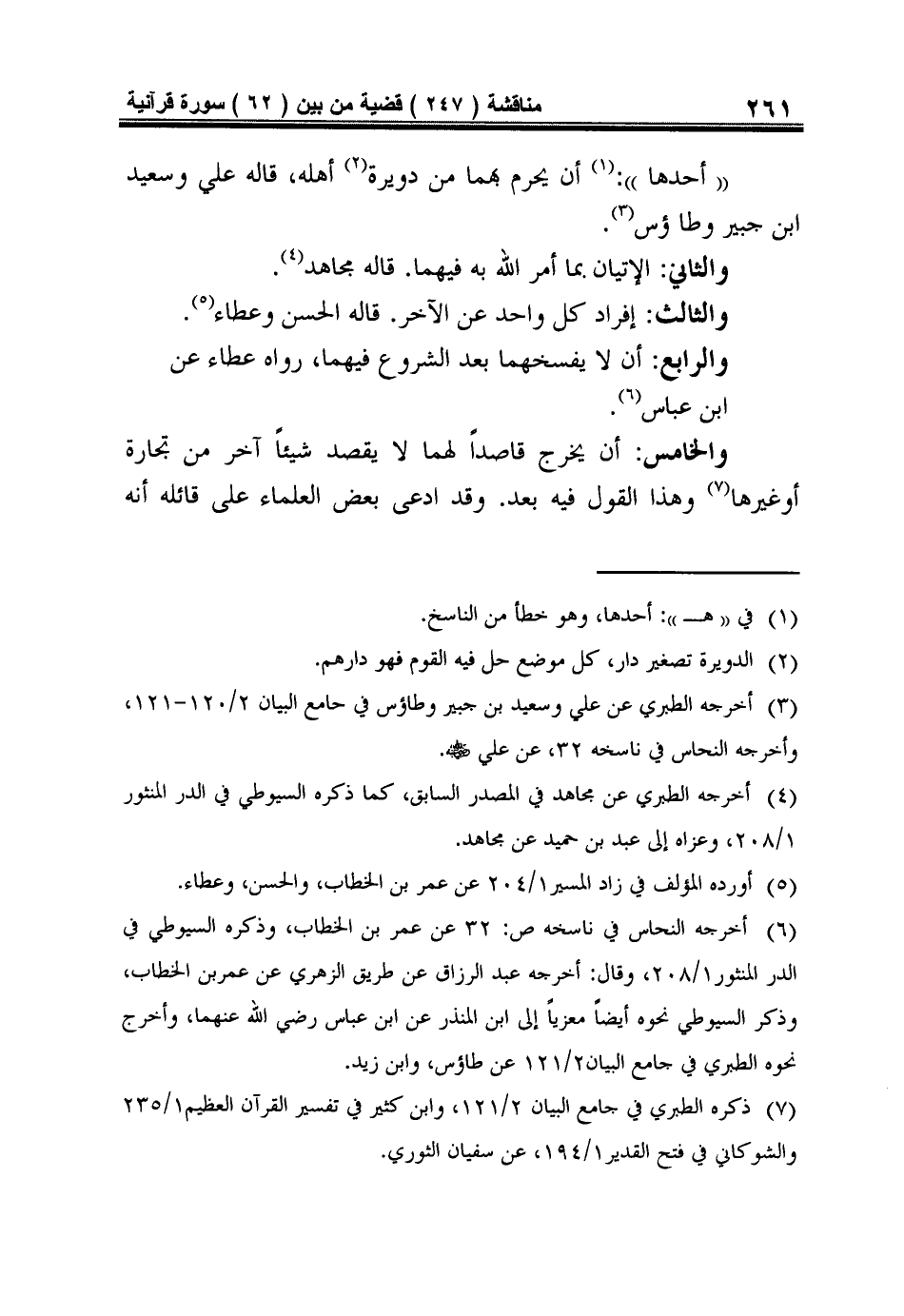 (أحدها):1 أَنْ يَحْرُمَ بِهِمَا مِنْ دُوَيْرَةِ2 أهله، قاله علي وسعيد ابن جبير وطاوس3.