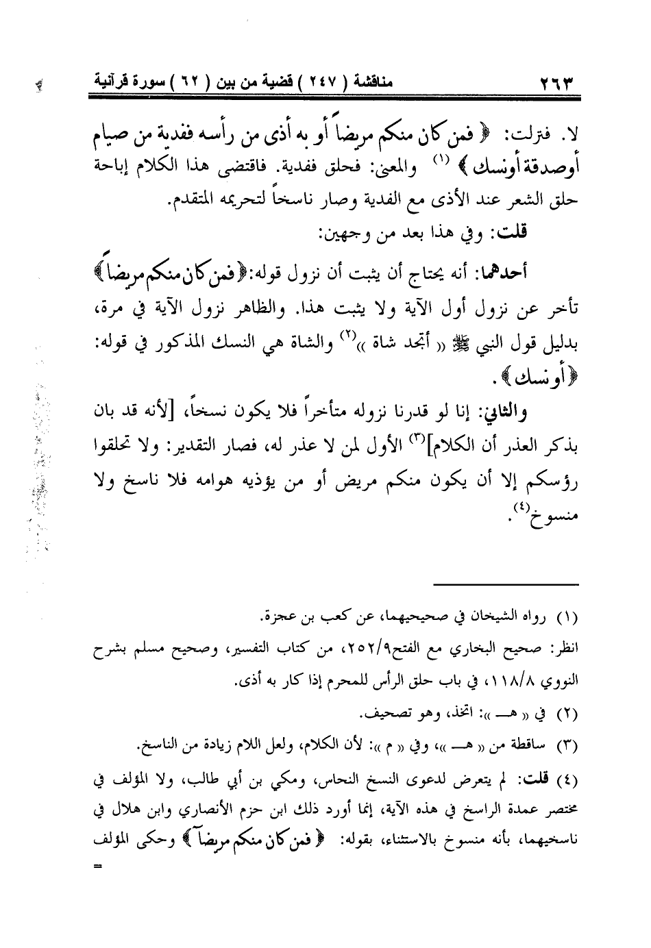 أحدهما: أَنَّهُ يَحْتَاجُ أَنْ يُثْبِتَ أَنَّ نُزُولَ قَوْلِهِ: {فَمَنْ كَانَ مِنْكُمْ مَرِيضاً} تَأَخَّرَ عَنْ نُزُولِ أَوَّلِ الْآيَةِ وَلا يَثْبُتُ هَذَا. وَالظَّاهِرُ نُزُولُ الْآيَةِ فِي مَرَّةٍ، بِدَلِيلِ قَوْلِ النَّبِيِّ صَلَّى اللَّهُ عَلَيْهِ وَسَلَّمَ "أَتَجِدُ شَاةً" 2 وَالشَّاةُ هِيَ النُّسُكُ الْمَذْكُورُ فِي قَوْلِهِ: {أَوْ نُسُكٍ}.