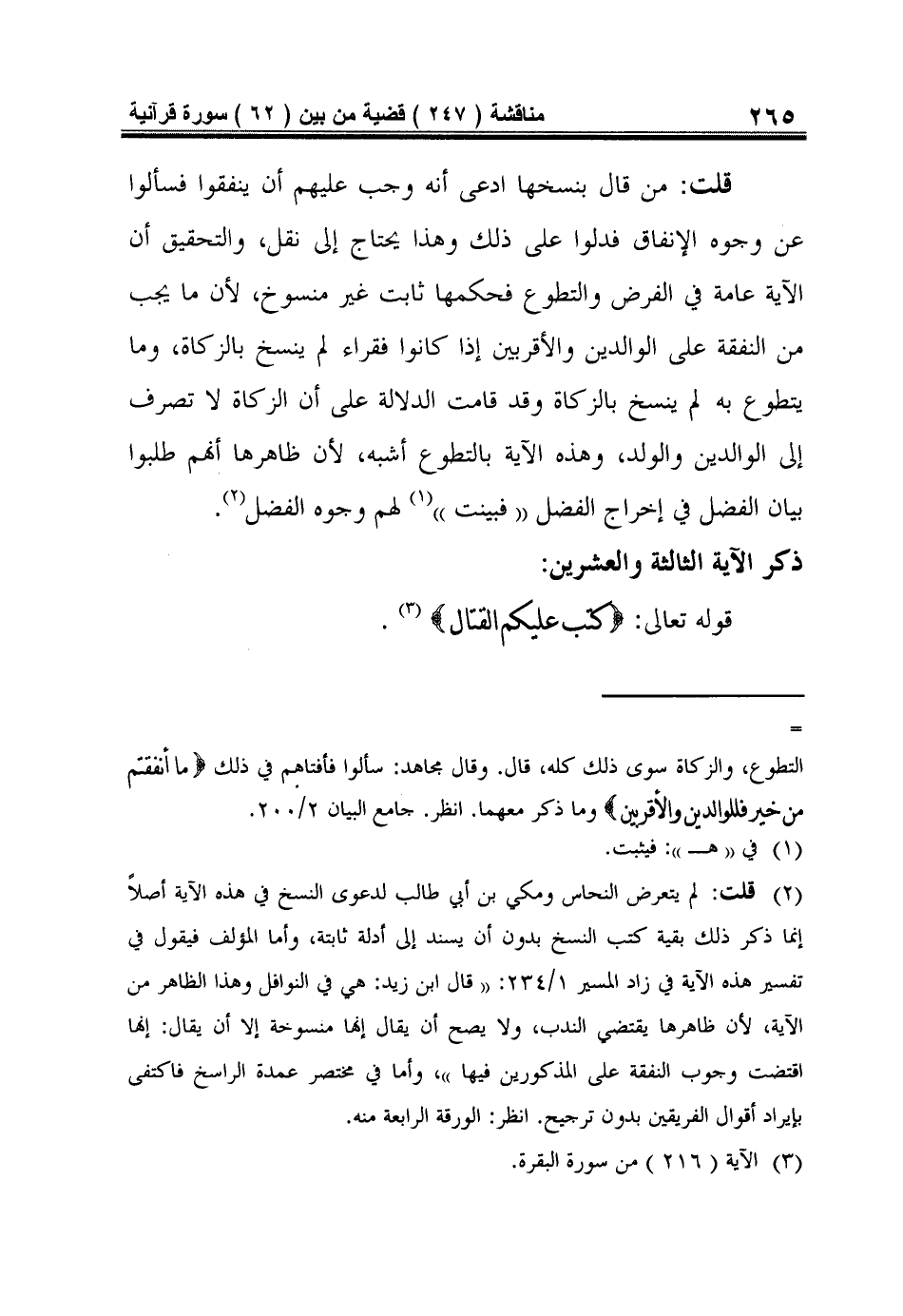 2 قلت: لم يتعرض النحاس ومكي بن أبي طالب لدعوى النسخ في هذه الآية أصلاً إنما ذكر ذلك بقية كتب النسخ بدون أن يسند إلى أدلة ثابتة، وأما المؤلف فيقول في تفسير هذه الآية في زاد المسير 1/ 234: "قال ابْنُ زَيْدٍ: هِيَ فِي النَّوَافِلِ وهذا الظاهر من الآية، لأن ظاهرها يقتضي الندب، ولا يصح أن يقال إنها منسوخة إلا أن يقال: إنها اقتضت وجوب النفقة على المذكورين فيها"، وأما في مختصر عمدة الراسخ فاكتفى بإيراد أقوال الفريقين بدون ترجيح. انظر: الورقة الرابعة منه.