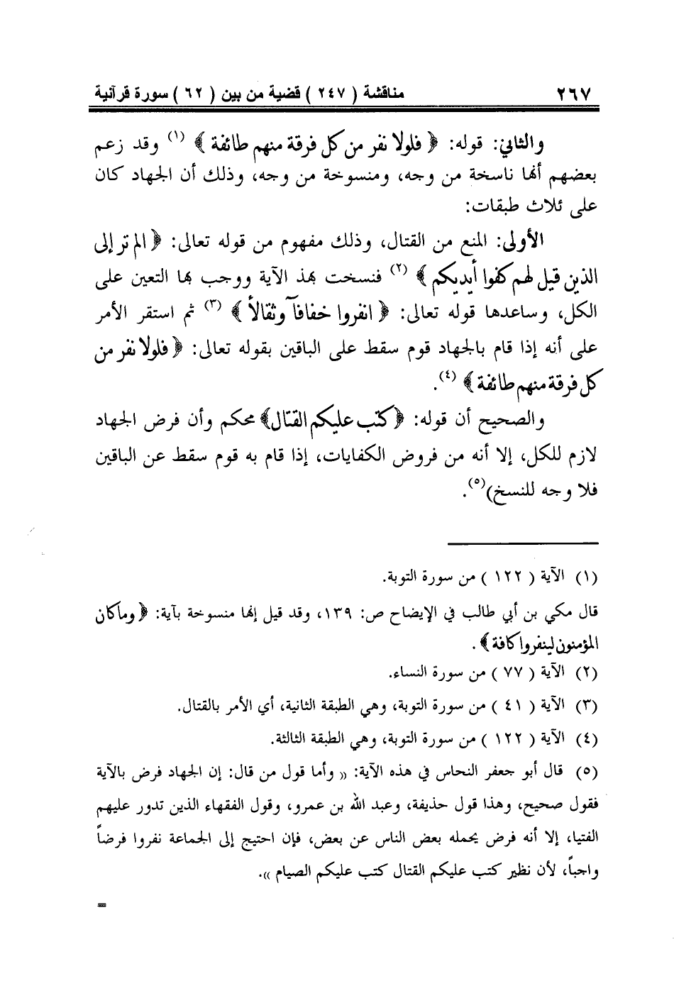 والثاني: قَوْلُهُ: {فَلَوْلا نَفَرَ مِنْ كُلِّ فِرْقَةٍ مِنْهُمْ طَائِفَةٌ} 1 وَقَدْ زَعَمَ بَعْضُهُمْ أَنَّهَا نَاسِخَةٌ مِنْ وَجْهٍ، وَمَنْسُوخَةٌ مِنْ وَجْهٍ، وَذَلِكَ أَنَّ الْجِهَادَ كَانَ عَلَى ئلاث طَبَقَاتٍ: