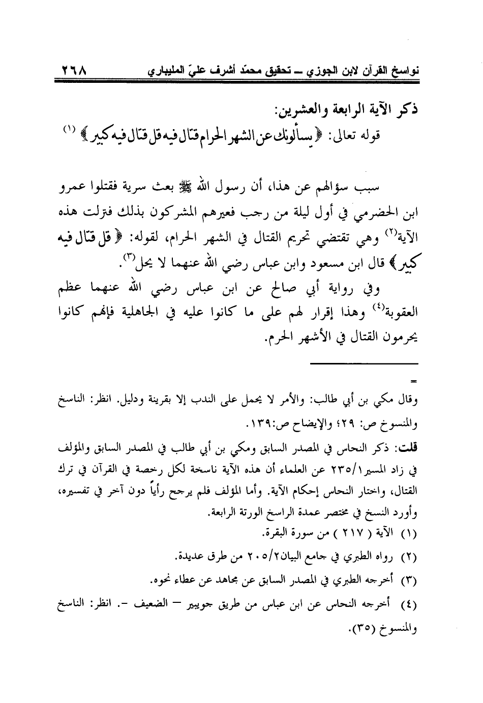 ذِكْرُ الْآيَةِ الرَّابِعَةِ وَالْعِشْرِينَ: قَوْلُهُ تَعَالَى: {يَسْأَلونَكَ عَنِ الشَّهْرِ الْحَرَامِ قِتَالٍ فِيهِ قُلْ قِتَالٌ فِيهِ كَبِيرٌ} 1