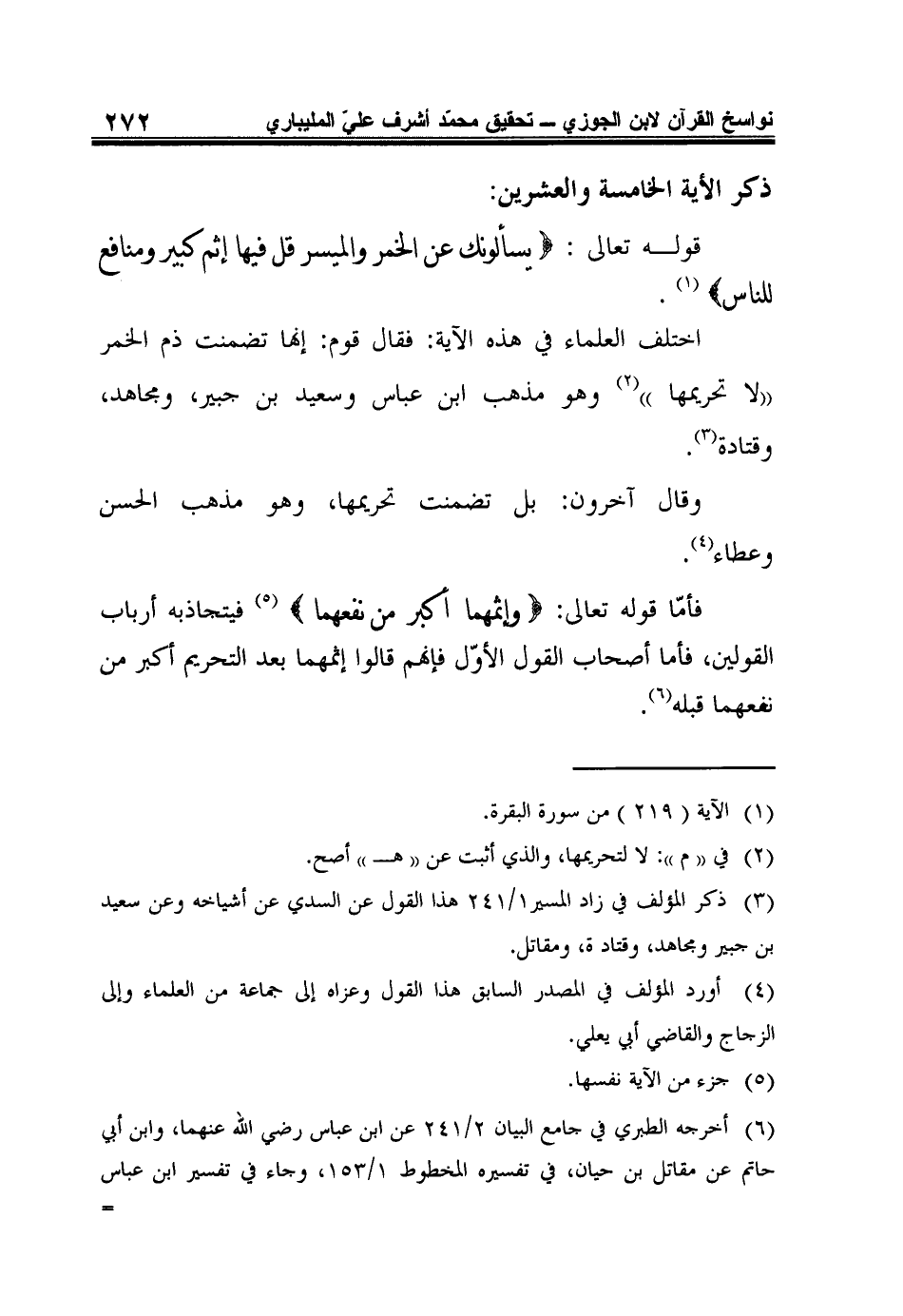 6 أخرجه الطبري في جامع البيان 2/ 241 عَنِ ابْنِ عَبَّاسٍ رَضِيَ اللَّهُ عنهما، وابن أبي حاتم عن مقاتل بن حيان، في تفسيره المخطوط 1/ 153، وجاء في تفسير ابن عباس (المنسوب إليه) (24) (قل) يا محمّد {فِيهِمَا إِثْمٌ كَبِيرٌ} بعد التحريم {وَمَنَافِعُ لِلنَّاسِ} قبل التحريم بالتجارة بهما {وَإِثْمُهُمَا} بعد التحريم {أَكْبَرُ مِنْ نَفْعِهِمَا} قبل التحريم، ثم حرم بعد ذلك في كليهما.