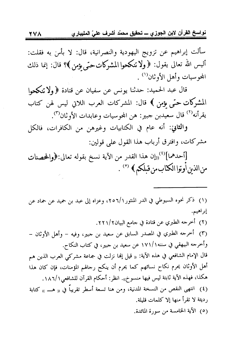 3 أخرجه الطبري في المصدر السابق عن سعيد بن جبير، وفيه - وأهل الأوثان - وأخرجه البيهقي في سننه1/ 171 عَنْ سَعِيدِ بْنِ جُبَيْرٍ، فِي كتاب النكاح.