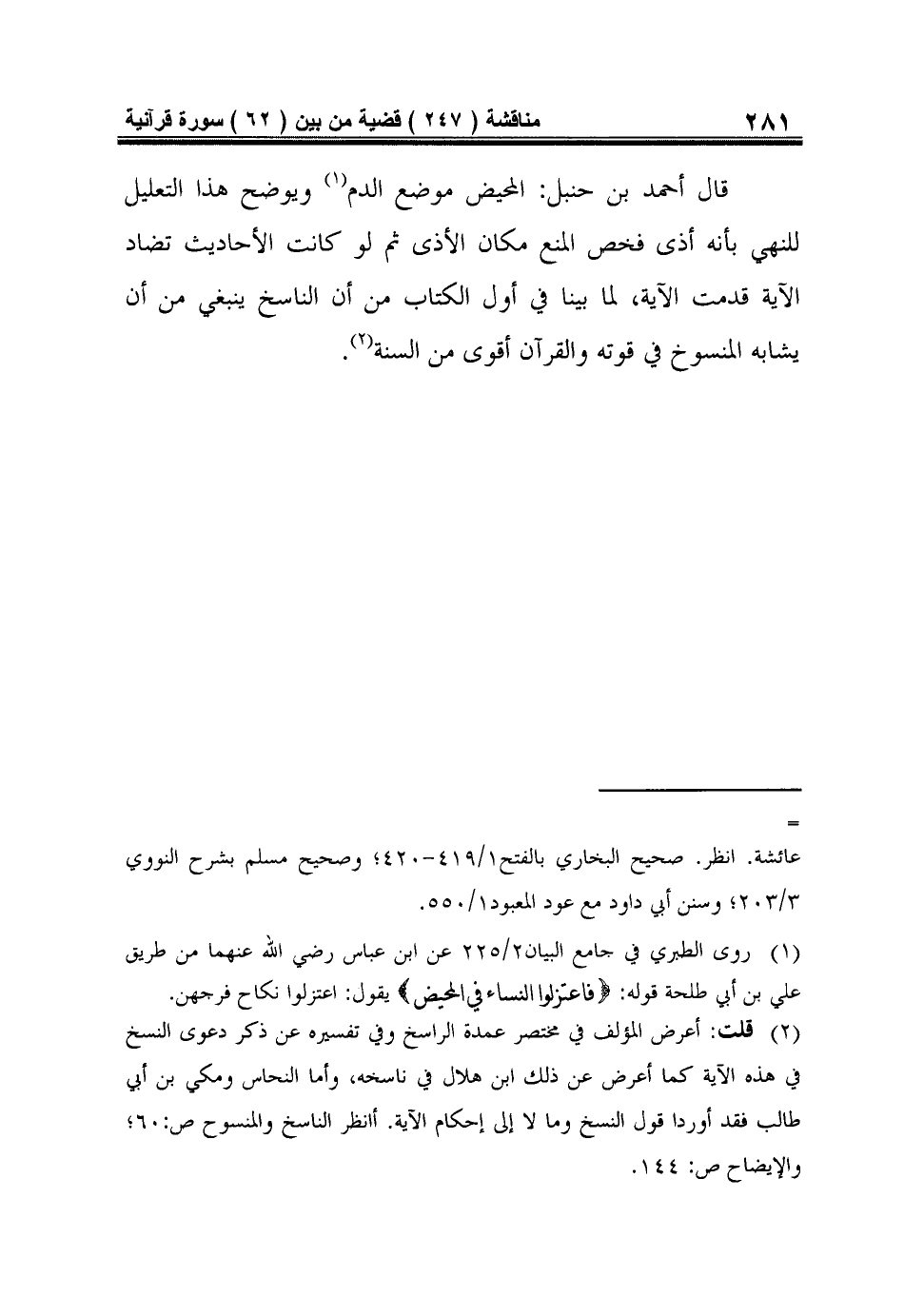 قال أحمد بن حنبل: المحيض مَوْضِعُ الدَّمِ1 وَيُوَضِّحُ هَذَا التَّعْلِيلُ لِلنَّهْيِ بِأَنَّهُ أَذًى فَخَصَّ الْمَنْعُ مَكَانَ الأَذَى ثُمَّ لَوْ كَانَتِ الأَحَادِيثُ تُضَادُّ الْآيَةِ قُدِّمَتِ الْآيَةُ، لِمَا بَيَّنَّا فِي أَوَّلِ الْكِتَابِ مِنْ أَنَّ النَّاسِخَ يَنْبَغِي مِنْ أَنْ يُشَابِهَ الْمَنْسُوخَ فِي قُوَّتِهِ والقرآن أقوى من السنة2.