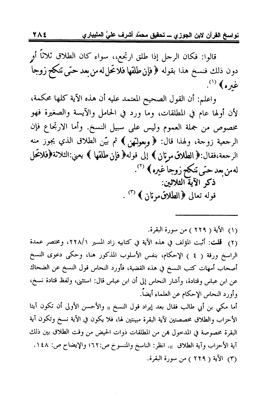 ذِكْرُ الْآيَةِ الثَّلاثِينَ: قَوْلُهُ تَعَالَى: {الطَّلاقُ مَرَّتَانِ} 3.