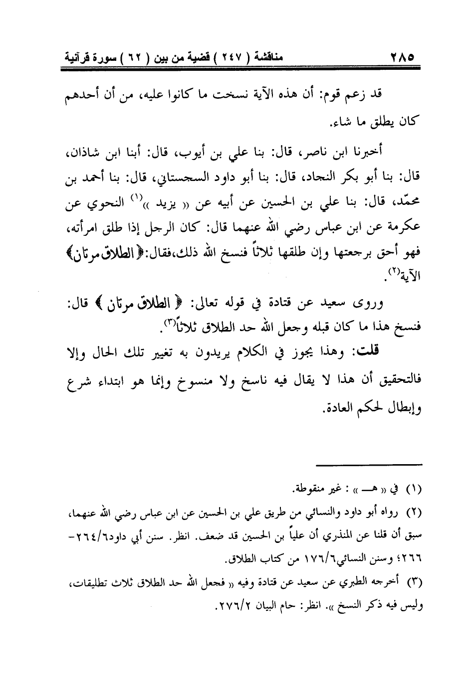 2 رواه أبو داود والنسائي من طريق علي بن الحسين عَنِ ابْنِ عَبَّاسٍ رَضِيَ اللَّهُ عنهما، سبق أن قلنا عن المنذري أن علياً بن الحسين قد ضعف. انظر. سنن أبي داود6/ 264 - 266؛ وسنن النسائي6/ 176 من كتاب الطلاق.