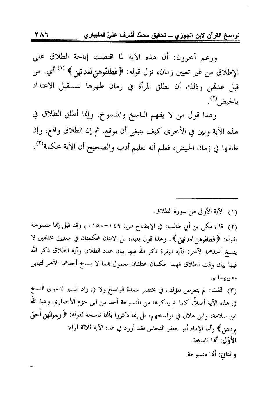3 قلت: لم يتعرص المؤلف في مختصر عمدة الراسخ ولا في زاد المسير لدعوى النسخ في هذه الآية أصلاً. كما لم يذكرها من المنسوخة أحد من ابن حزم الأنصاري وهبة الله ابن سلامة، وابن هلال في نواسخهم، بل إنما ذكروا بأنها ناسخة لقوله: {وَبُعُولَتُهُنَّ أَحَقُّ بِرَدِّهِنَّ} وأما الإمام أبو جعفر النحاس فقد أورد في هده الآية ثلاثة آراء: