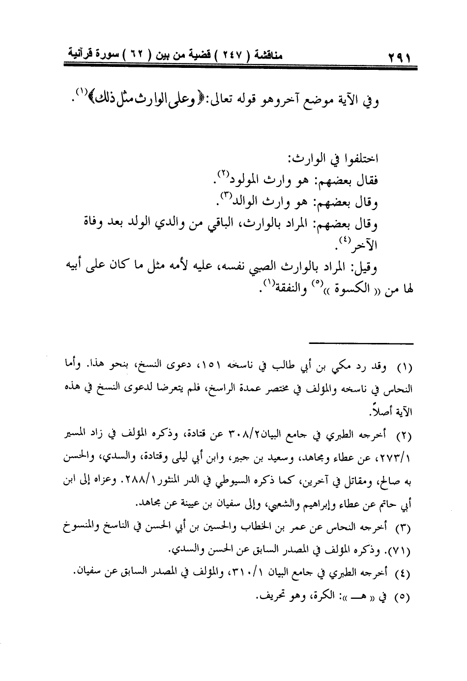 1 وقد رد مكي بن أبي طالب في ناسخه 151، دعوى النسخ، بنحو هذا. وأما النحاس في ناسخه والمؤلف في مختصر عمدة الراسخ، فلم يتعرضا لدعوى النسخ في هذه الآية أصلاً.