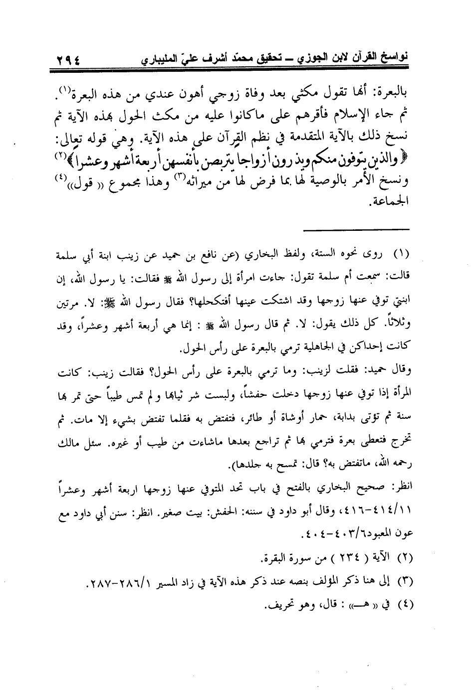 بِالْبَعْرَةِ: أَنَّهَا تَقُولُ مُكْثِي بَعْدَ وَفَاةِ زَوْجِي أَهْوَنُ عِنْدِي مِنْ هَذِهِ الْبَعْرَةِ1. ثُمَّ جَاءَ الْإِسْلامُ فأقرهم على ماكانوا عَلَيْهِ مِنْ مُكْثِ الْحَوْلِ بِهَذِهِ الْآيَةِ ثُمَّ نُسِخَ ذَلِكَ بِالْآيَةِ الْمُتَقَدِّمَةِ فِي نَظْمِ الْقُرْآنِ عَلَى هَذِهِ الْآيَةِ. وَهِيَ قَوْلُهُ تَعَالَى: {وَالَّذِينَ يُتَوَفَّوْنَ مِنْكُمْ وَيَذَرُونَ أَزْوَاجاً يَتَرَبَّصْنَ بِأَنْفُسِهِنَّ أَرْبَعَةَ أَشْهُرٍ وَعَشْراً} 2 وَنُسِخَ الأَمْرُ بِالْوَصِيَّةِ لَهَا بِمَا فَرَضَ لَهَا مِنْ مِيرَاثِهِ3 وَهَذَا مجموع (قول) 4 الجماعة.