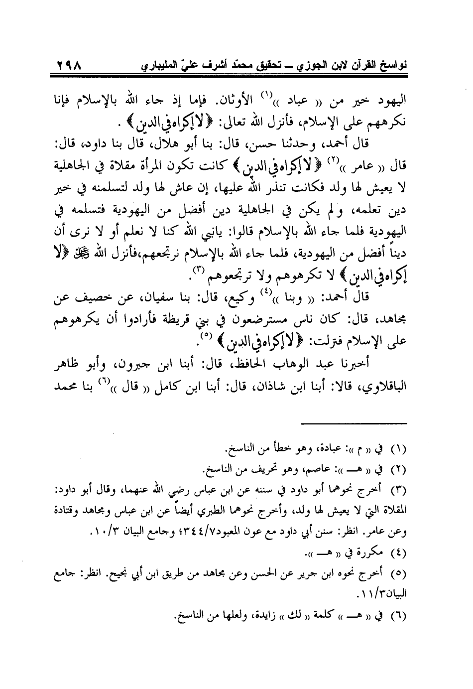 قال أحمد، وحدثنا حسن، قال: بنا أبو هلال، قال بنا دَاوُدُ، قَالَ: قَالَ (عَامِرٌ) 2 {لا إِكْرَاهَ فِي الدِّينِ} كَانَتْ تَكُونُ الْمَرْأَةُ مِقْلاةً فِي الْجَاهِلِيَّةِ لا يَعِيشُ لَهَا وَلَدٌ فَكَانَتْ تُنْذِرُ اللَّهَ عَلَيْهَا، إِنْ عَاشَ لَهَا وَلَدٌ لَتُسَلِّمَنَّهُ فِي خَيْرِ دِينٍ تَعْلَمُهُ، وَلَمْ يَكُنْ فِي الْجَاهِلِيَّةِ دِينٌ أَفْضَلَ مِنَ الْيَهُودِيَّةِ فَتُسَلِّمُهُ فِي الْيَهُودِيَّةِ فَلَمَّا جاء الله بالإسلام قالوا: يانبي اللَّهِ كُنَّا لا نَعْلَمُ أَوْ لا نَرَى أَنَّ دِينًا أَفْضَلَ مِنَ الْيَهُودِيَّةِ، فَلَمَّا جَاءَ اللَّهُ بالإسلام نرتجعهم، فأنزل الله عزوجل {لا إِكْرَاهَ فِي الدِّينِ} لا تُكْرِهُوهُمْ وَلا تَرْتَجِعُوهُمْ 3.