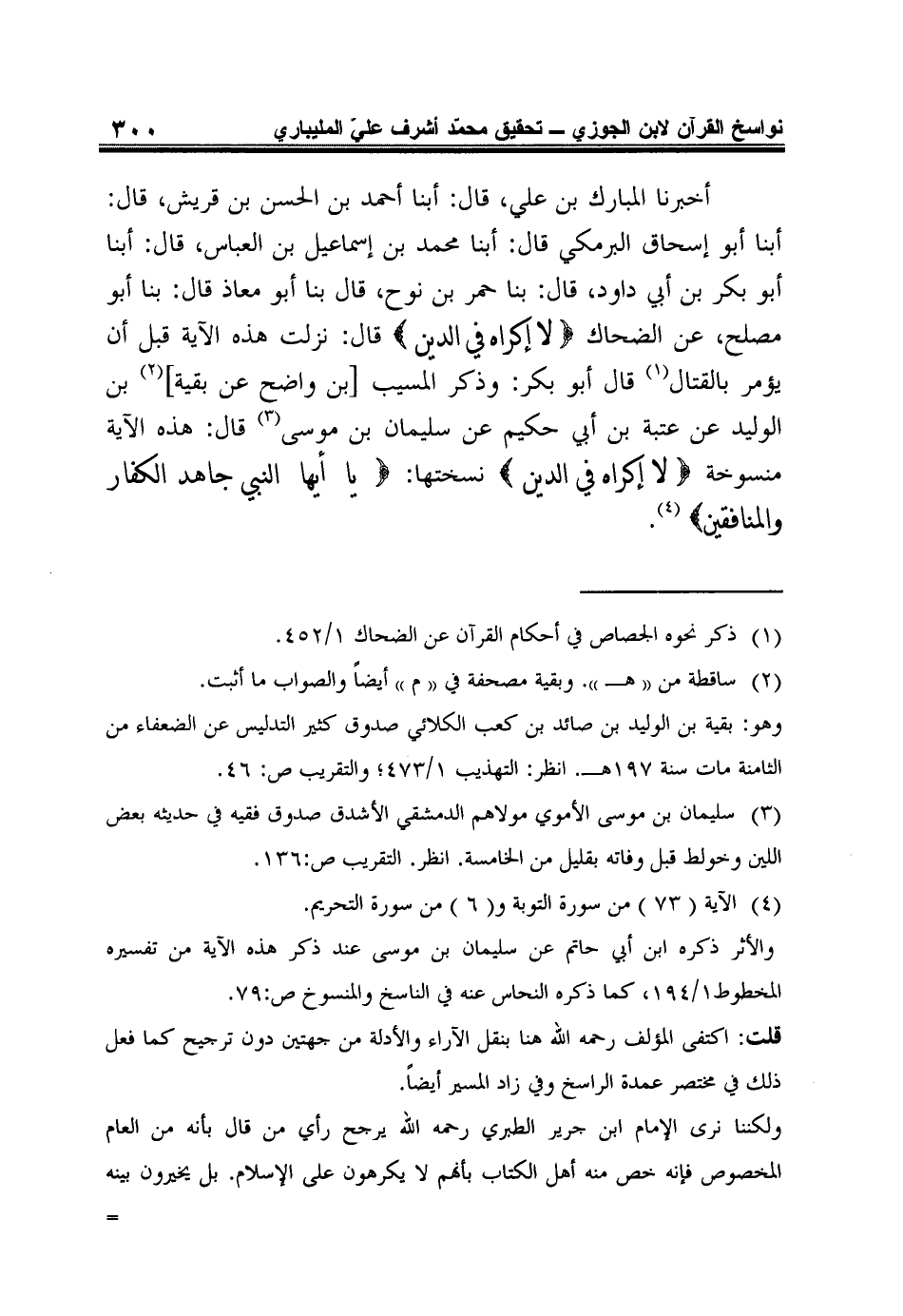 أَخْبَرَنَا الْمُبَارَكُ بْنُ عَلِيٍّ، قَالَ: أَبْنَا أَحْمَدُ بْنُ الْحَسَنِ بْنِ قُرَيْشٍ، قَالَ: أَبْنَا أَبُو إِسْحَاقَ الْبَرْمَكِيُّ قَالَ: أَبْنَا مُحَمَّدُ بْنُ إِسْمَاعِيلَ بْنِ الْعَبَّاسِ، قَالَ: أَبْنَا أَبُو بَكْرِ بْنُ أَبِي دَاوُدَ، قال: بنا حمر بن نوح، قال بنا أبو معاذ قال: بنا أَبُو مُصْلِحٍ، عَنِ الضَّحَّاكِ {لا إِكْرَاهَ فِي الدِّينِ} قَالَ: نَزَلَتْ هَذِهِ الْآيَةُ قَبْلَ أَنْ يُؤْمَرَ بِالْقِتَالِ1 قَالَ أَبُو بَكْرٍ: وَذَكَرَ الْمُسَيَّبُ [بْنُ وَاضِحٍ عَنْ بَقِيَّةَ] 2 بْنِ الْوَلِيدِ عَنْ عُتْبَةَ بْنِ أَبِي حَكِيمٍ عَنْ سُلَيْمَانَ بْنِ مُوسَى3 قَالَ: هَذِهِ الآيَةُ مَنْسُوخَةٌ {لا إِكْرَاهَ فِي الدِّينِ} نسختها: {يَا أَيُّهَا النَّبِيُّ جَاهِدِ الْكُفَّارَ وَالْمُنَافِقِينَ} 4.