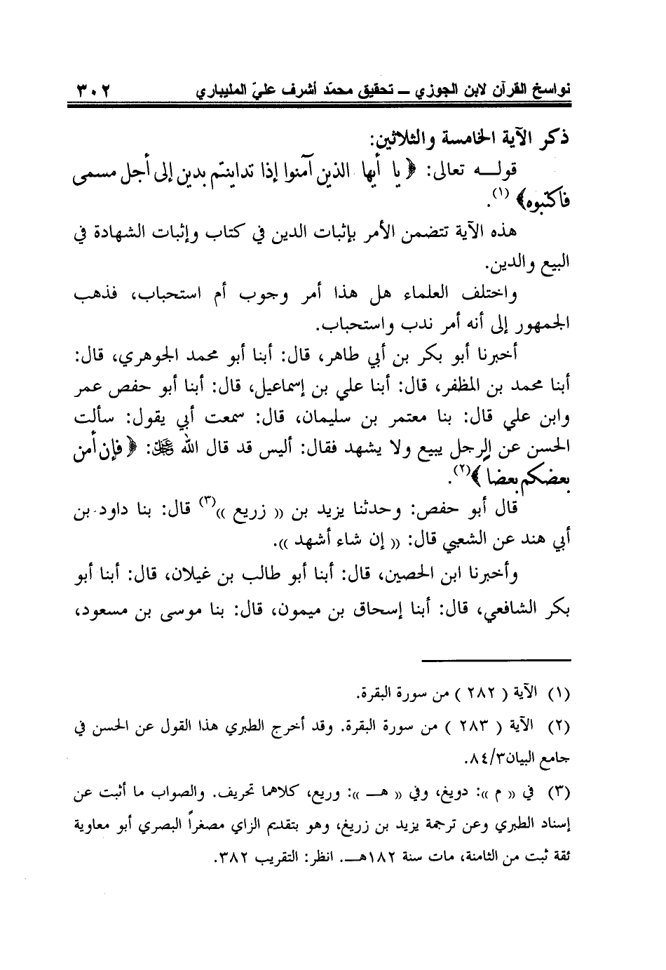 هَذِهِ الآيَةُ تَتَضَمَّنُ الأَمْرَ بِإِثْبَاتِ الدَّيْنِ فِي كِتَابٍ وَإِثْبَاتِ الشَّهَادَةِ فِي الْبَيْعِ وَالدَّيْنِ.