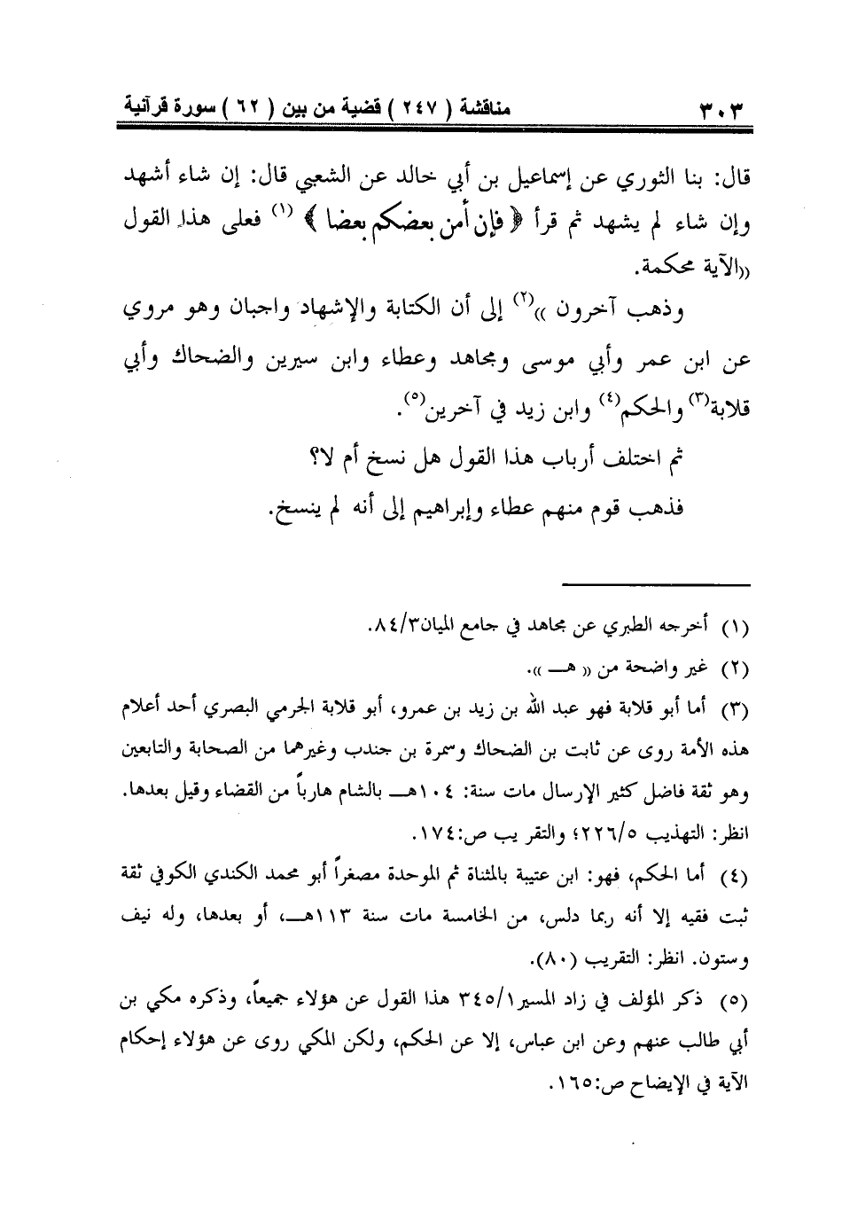 قال: بنا الثَّوْرِيُّ عَنْ إِسْمَاعِيلَ بْنِ أَبِي خَالِدٍ عَنِ الشَّعْبِيِّ قَالَ: إِنْ شَاءَ أَشْهَدَ وَإِنْ شَاءَ لَمْ يُشْهِدْ ثُمَّ قَرَأَ {فَإِنْ أَمِنَ بَعْضُكُمْ بَعْضاً} 1 فَعَلَى هَذَا الْقَوْلِ (الْآيَةُ مُحْكَمَةٌ).