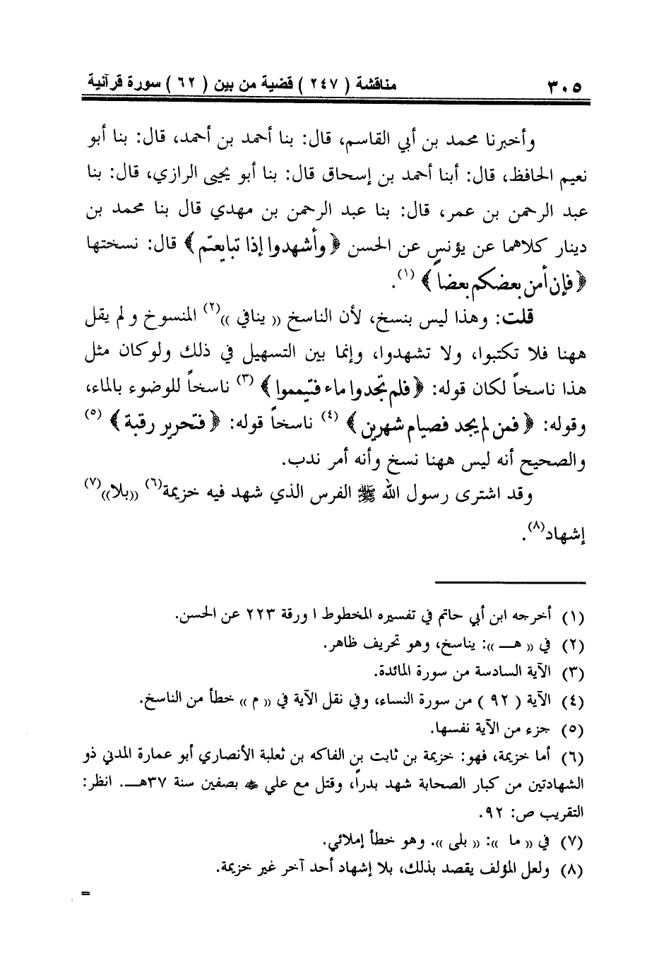 8 ولعل المؤلف يقصد بذلك، بلا إشهاد أحد آخر غير خزيمة.