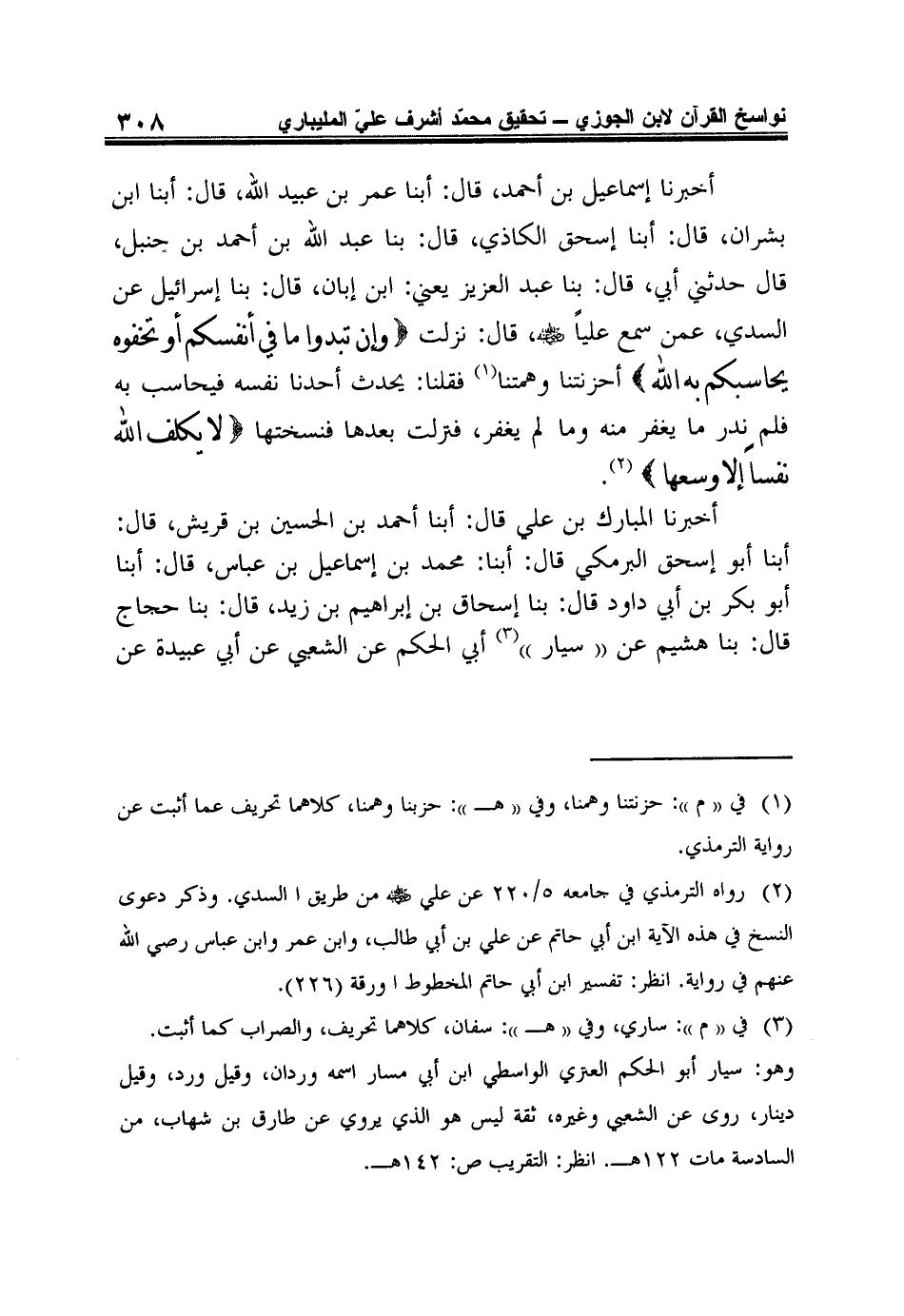 أَخْبَرَنَا إِسْمَاعِيلُ بْنُ أَحْمَدَ، قَالَ: أَبْنَا عُمَرُ بْنُ عُبَيْدِ اللَّهِ، قَالَ: أَبْنَا ابْنُ بِشْرَانَ، قَالَ: أبنا إسحق الكاذي، قال: بنا عَبْدُ اللَّهِ بْنُ أَحْمَدَ بْنِ حَنْبَلٍ، قَالَ حَدَّثَنِي أَبِي، قَالَ: بنا عَبْدُ الْعَزِيزِ يَعْنِي: ابْنَ أَبَانٍ، قال: بنا إِسْرَائِيلُ عَنِ السُّدِّيِّ، عَمَّنْ سَمِعَ عَلِيًّا رَضِيَ اللَّهُ عَنْهُ، قَالَ: نزلت {لله مَا فِي السَّمَاوَاتِ وَمَا فِي الأَرْضِ وَإِنْ تُبْدُوا مَا فِي أَنْفُسِكُمْ أَو تُخْفُوهُ يُحَاسِبْكُمْ بِهِ اللَّهُ} أَحْزَنَتْنَا وَهَمَّتْنَا1 فَقُلْنَا: يُحَدِّثُ أَحَدُنَا نَفْسَهُ فَيُحَاسَبُ بِهِ فَلَمْ نَدْرِ مَا يُغْفَرُ مِنْهُ وَمَا لَمْ يُغْفَرْ، فَنَزَلَتْ بَعْدَهَا فَنَسَخَتْهَا {لا يُكَلِّفُ اللَّهُ نَفْساً إِلاّ وُسْعَهَا} 2.