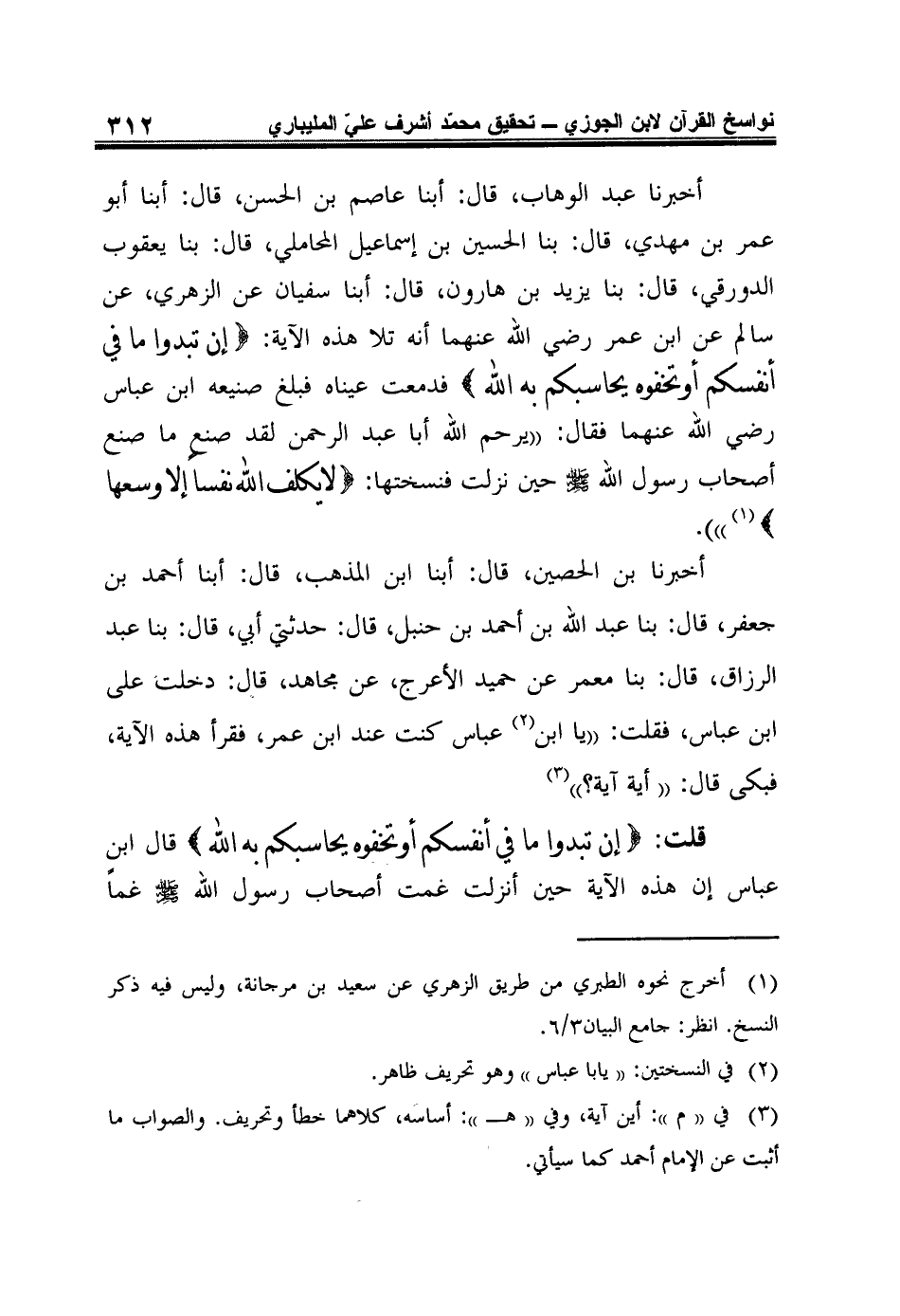 أَخْبَرَنَا عَبْدُ الْوَهَّابِ، قَالَ: أَبْنَا عَاصِمُ بْنُ الْحَسَنِ، قَالَ: أَبْنَا أَبُو عُمَرَ بْنُ مَهْدِيٍّ، قَالَ: بنا الْحُسَيْنُ بْنُ إِسْمَاعِيلَ الْمَحَامِلِيُّ، قَالَ: بنا يعقوب الدورقي، قال: بنا يَزِيدُ بْنُ هَارُونَ، قَالَ: أَبْنَا سُفْيَانُ عَنِ الزُّهْرِيِّ، عَنْ سَالِمٍ عَنِ ابْنِ عُمَرَ رَضِيَ اللَّهُ عَنْهُمَا أَنَّهُ تَلا هَذِهِ الْآيَةَ: {إن تُبْدُوا مَا فِي أَنْفُسِكُمْ أَو تُخْفُوهُ يُحَاسِبْكُمْ بِهِ اللَّهُ} فَدَمِعَتْ عَيْنَاهُ فَبَلَغَ صَنِيعُهُ ابْنَ عَبَّاسٍ رَضِيَ اللَّهُ عَنْهُمَا فَقَالَ: "يَرْحَمُ اللَّهُ أَبَا عَبْدِ الرَّحْمَنِ لَقَدْ صَنَعَ مَا صَنَعَ أَصْحَابُ رَسُولُ اللَّهِ صَلَّى اللَّهُ عَلَيْهِ وَسَلَّمَ حِينَ نَزَلَتْ فَنَسَخَتْهَا: {لا يُكَلِّفُ اللَّهُ نَفْساً إِلاّ وُسْعَهَا} 1".