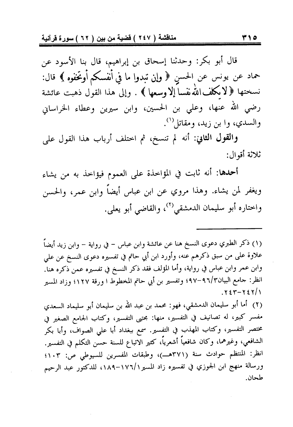 قَالَ أَبُو بَكْرٍ: وَحَدَّثَنَا إِسْحَاقُ بن إبراهيم، قال بنا الأَسْوَدُ عَنْ حَمَّادٍ عَنْ يُونُسَ عن الحسن {إن تُبْدُوا مَا فِي أَنْفُسِكُمْ أَو تُخْفُوهُ} قَالَ: نَسَخَتْهَا {لا يُكَلِّفُ اللَّهُ نَفْساً إِلاّ وُسْعَهَا}. وَإِلَى هَذَا الْقَوْلِ ذَهَبَتْ عَائِشَةُ رَضِيَ اللَّهُ عَنْهَا، وَعَلِيُّ بْنُ الْحُسَيْنِ، وَابْنُ سِيرِينَ وَعَطَاءٌ الْخُرَاسَانِيُّ والسدي، وا بن زيد، ومقاتل1.