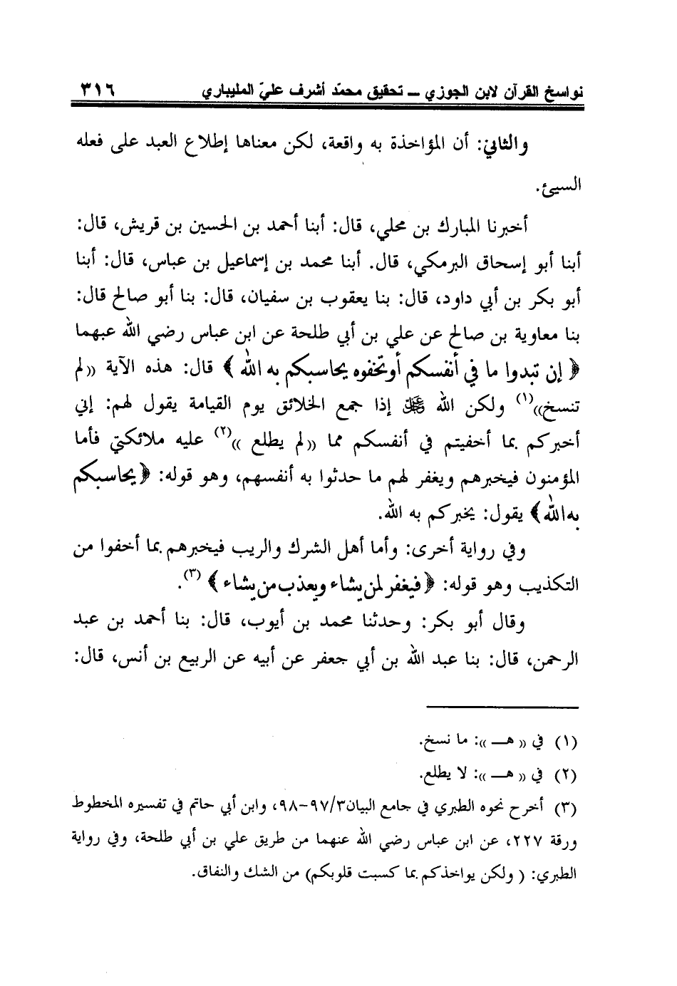 أخبرنا المبارك بن محلي، قَالَ: أَبْنَا أَحْمَدُ بْنُ الْحُسَيْنِ بْنِ قُرَيْشٍ، قَالَ: أَبْنَا أَبُو إِسْحَاقَ الْبَرْمَكِيُّ، قَالَ. أَبْنَا مُحَمَّدُ بن إسماعيل بن عباس، قَالَ: أَبْنَا أَبُو بَكْرِ بْنُ أبي داود، قال: بنا يعقوب بن سفيان، قال: بنا أبو صالح قال: بنا مُعَاوِيَةُ بْنُ صَالِحٍ عَنْ عَلِيِّ بْنِ أَبِي طَلْحَةَ عَنِ ابْنِ عباس رضي الله عبهما {إن تُبْدُوا مَا فِي أَنْفُسِكُمْ أَو تُخْفُوهُ يُحَاسِبْكُمْ بِهِ اللَّهُ} قَالَ: هَذِهِ الْآيَةُ (لَمْ تُنْسَخْ) 1 ولكن الله عزوجل إِذَا جَمَعَ الْخَلائِقَ يَوْمَ الْقِيَامَةِ يَقُولُ لَهُمْ: إِنِّي أُخْبِرُكُمْ بِمَا أَخْفَيْتُمْ فِي أَنْفُسِكُمْ مِمَّا (لَمْ يَطَّلِعْ) 2 عَلَيْهِ مَلائِكَتِي فَأَمَّا الْمُؤْمِنُونَ فَيُخْبِرُهُمْ وَيَغْفِرُ لَهُمْ مَا حَدَّثُوا بِهِ أَنْفُسَهُمْ، وَهُوَ قَوْلُهُ: {يُحَاسِبْكُمْ بِهِ اللَّهُ} يَقُولُ: يُخْبِرُكُمْ بِهِ اللَّهُ.