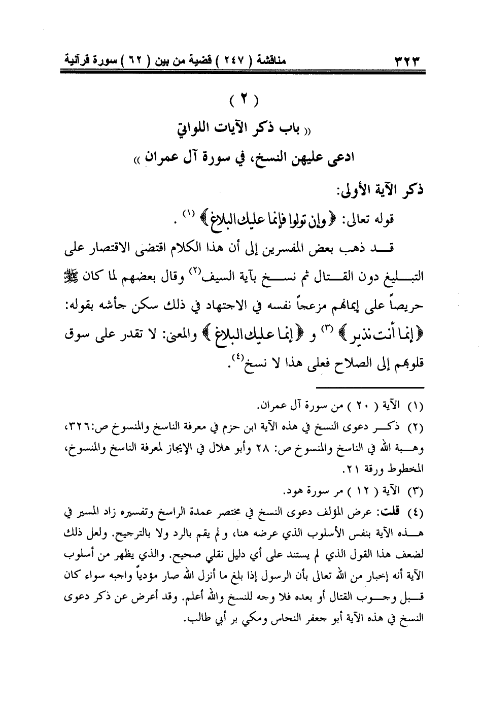بَابُ: ذِكْرِ الْآيَاتِ اللَّوَاتِي ادُّعِيَ عَلَيْهِنَّ النَّسْخُ فِي سُورَةِ آلِ عِمْرَانَ