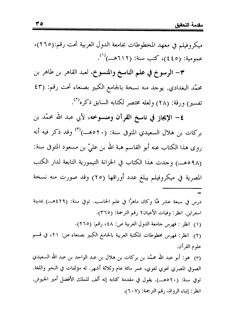 4 - الإيجاز في ناسخ القرآن ومنسوخه، لأبي عبد الله محمّد بن بركات بن هلال السعيدي المتوفى سنة: (520هـ) 3 وقد ذكر فيه أنه روى هذا الكتاب عنه أبو القاسم هبة الله بن عليّ بن مسعود المتوفى سنة: (598هـ) وجدت هذا الكتاب في الخزانة التيمورية التابعة لدار الكتب المصرية في ميكروفيلم يبلغ عدد أوراقها (25) وقد صورت منه نسخة