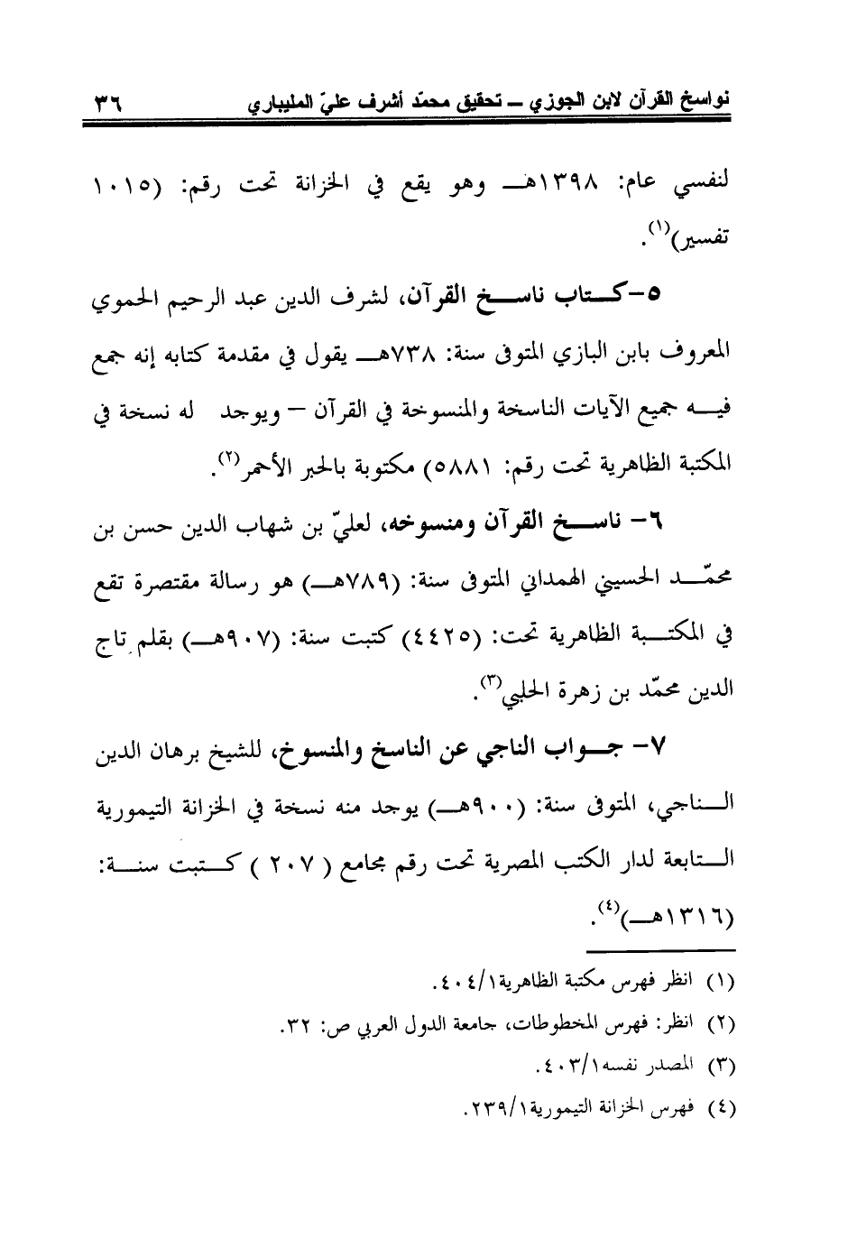 6 - ناسخ القرآن ومنسوخه، لعليّ بن شهاب الدين حسن بن محمّد الحسيني الهمداني المتوفى سنة: (789هـ) هو رسالة مقتصرة تقع في المكتبة الظاهرية تحت: (4425) كتبت سنة: (907هـ) بقلم تاج الدين محمّد بن زهرة الحلبي3.