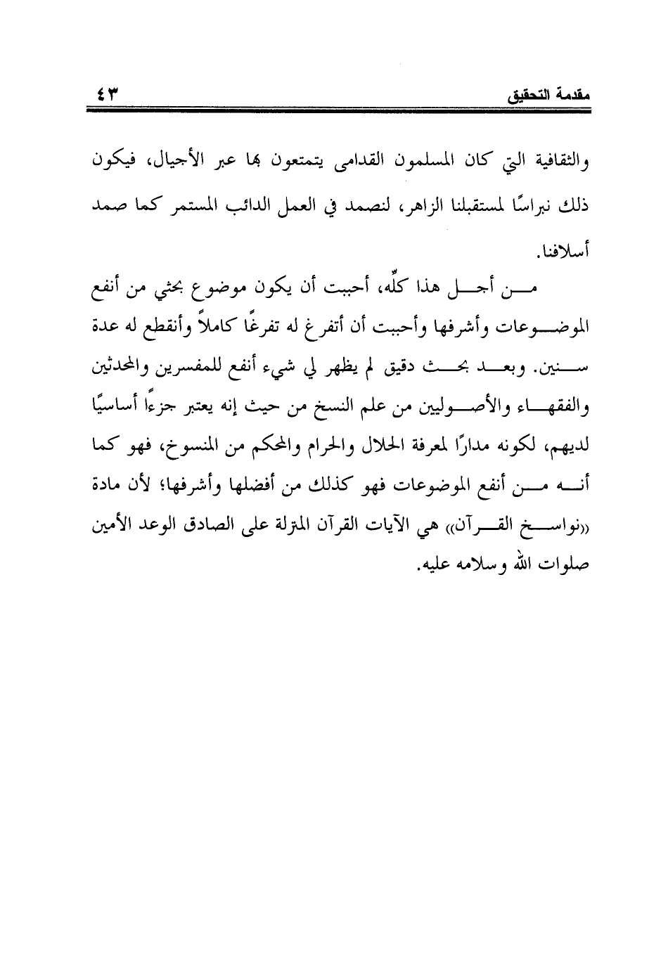 من أجل هذا كلِّه، أحببت أن يكون موضوع بحثي من أنفع الموضوعات وأشرفها وأحببت أن أتفرغ له تفرغًا كاملاً وأنقطع له عدة سنين. وبعد بحث دقيق لم يظهر لي شيء أنفع للمفسرين والمحدثين والفقهاء والأصوليين من علم النسخ من حيث إنه يعتبر جزءًا أساسيًا لديهم، لكونه مدارًا لمعرفة الحلال والحرام والمحكم من المنسوخ، فهو كما أنه من أنفع الموضوعات فهو كذلك من أفضلها وأشرفها؛ لأن مادة (نواسخ القرآن) هي الآيات القرآن المنزلة على الصادق الوعد الأمين صلوات الله وسلامه عليه.