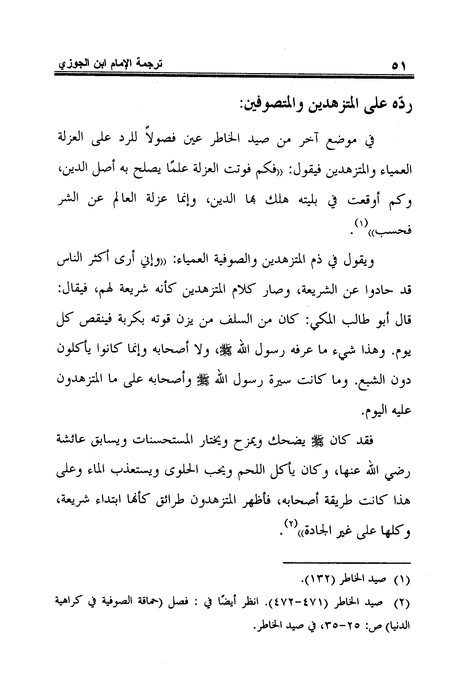 2 صيد الخاطر (471 - 472). انظر أيضاً في فصل (حماقة الصوفية في كراهية الدنيا) ص: 25 - 35, في صيد الخاطر.